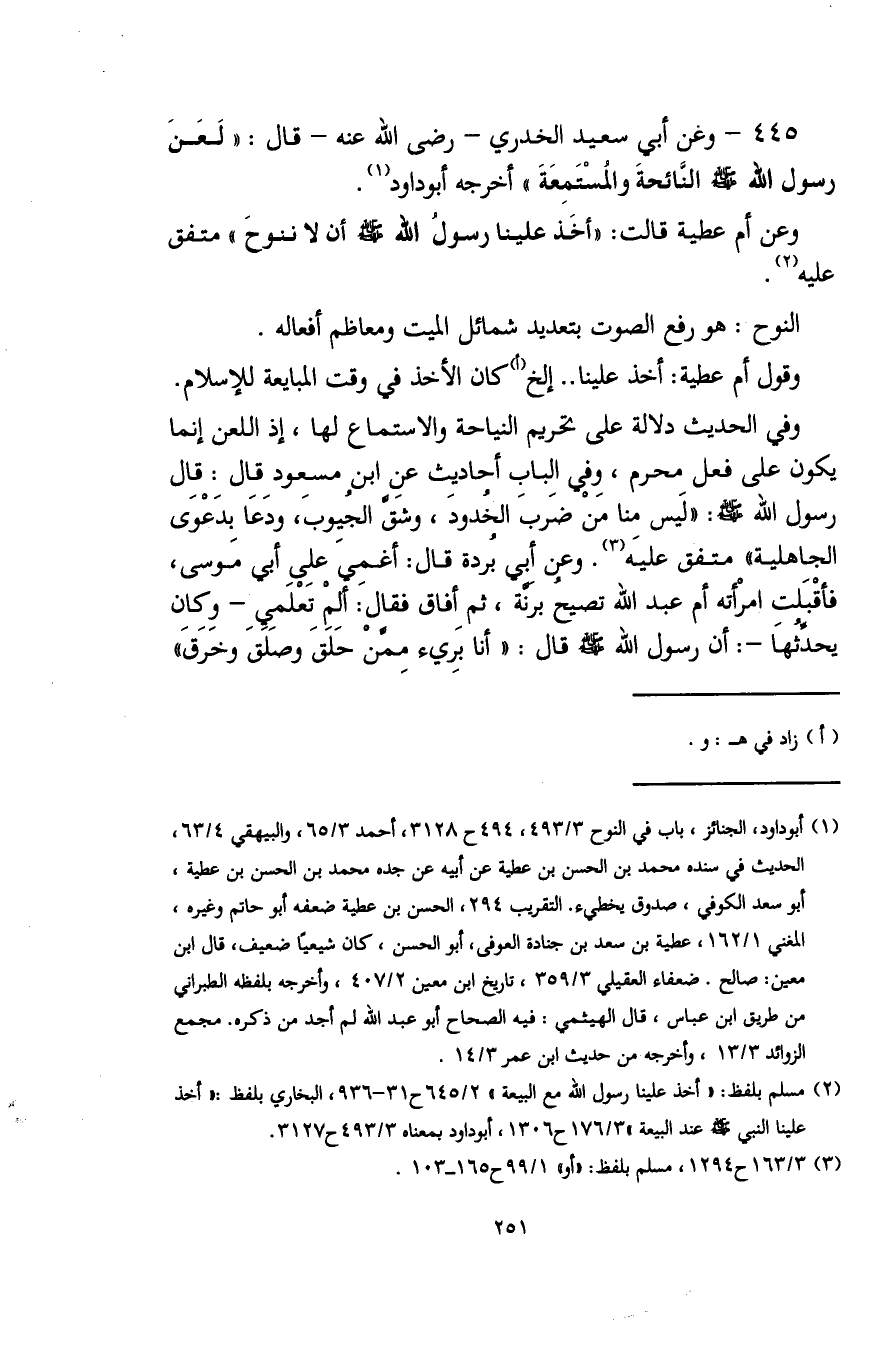 445 - وعن أبي سعيد الخدري - رضي الله عنه - قال: "لَعَنَ رسول الله - صلى الله عليه وسلم - النَّائحةَ والمسْتَمِعَةَ" أخرجه أبو داود (¬1).
