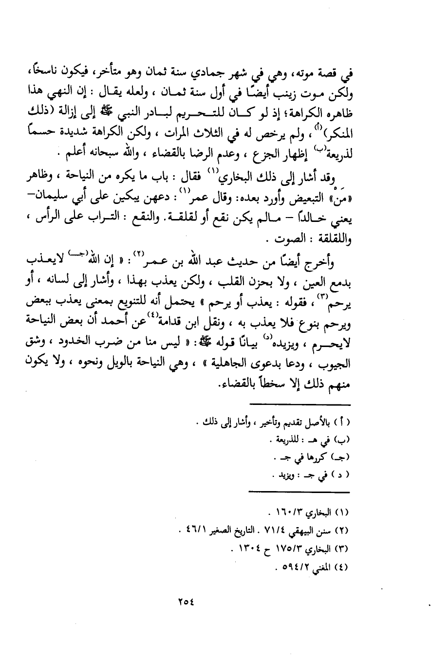 في قصة موته، وهي في شهر جمادي سنة ثمان وهو متأخر، فيكون ناسخًا، ولكن موت زينب أيضًا في أول سنة ثمان، ولعله يقال: إن النهي هذا ظاهره الكراهة؛ إذ لو كان للتحريم لبادر النبي - صلى الله عليه وسلم - إلى إزالة (ذلك المنكر) (أ)، ولم يرخص له في الثلاث المرات، ولكن الكراهة شديدة حسمًا لذريعة (ب) إظهار الجزع، وعدم الرضا بالقضاء، والله سبحانه أعلم.