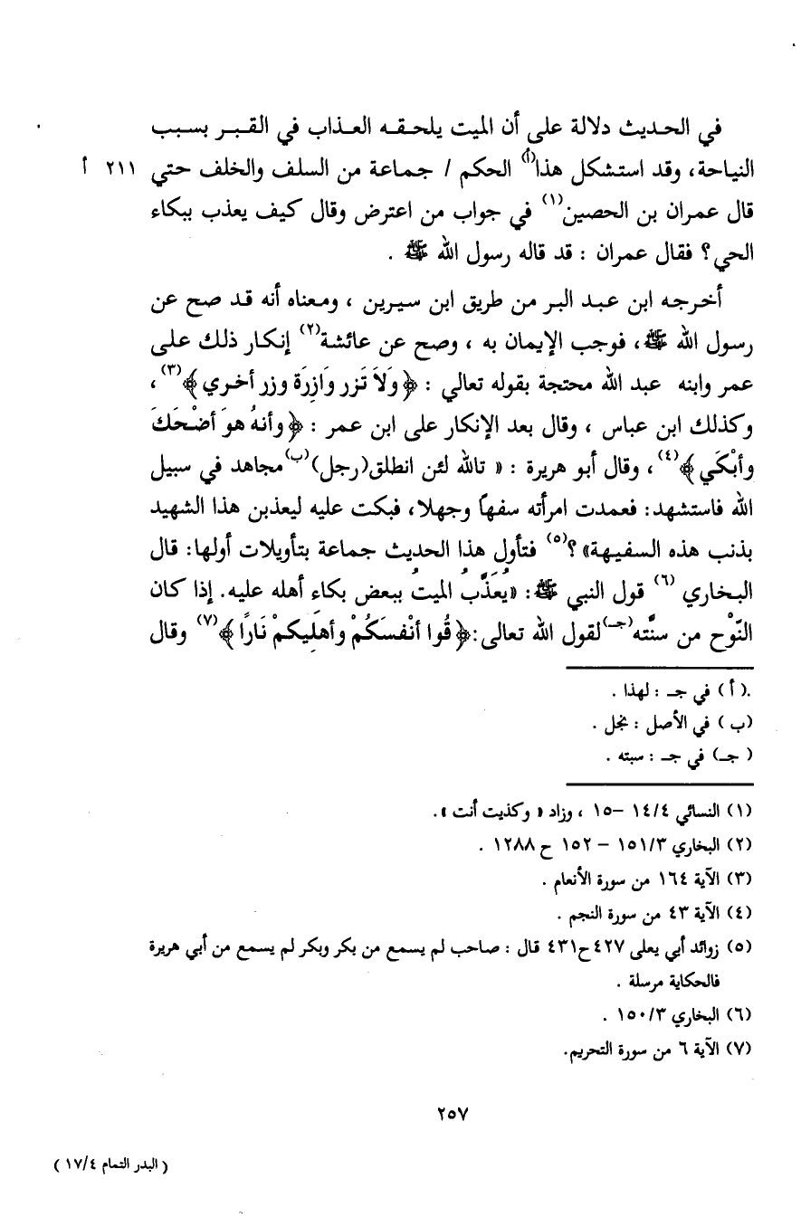 أخرجه ابن عبد البر من طريق ابن سيرين، ومعناه أنه قد صح عن رسول الله - صلى الله عليه وسلم -، فوجب الإيمان به، وصح عن عائشة (¬2) إنكار ذلك على عمر وابنه عبد الله محتجة بقوله تعالى: {وَلَا تَزر وَازِرَة وزر أخرى} (¬3)، وكذلك ابن عباس، وقال بعد الإنكار على ابن عمر: {وأنه هوَ أضْحَكَ وأبْكَى} (¬4)، وقال أبو هريرة: "تالله لئن انطلق (رجل) (ب) مجاهد في سبيل الله فاستشهد: فعمدت امرأته سفهًا وجهلا، فبكت عليه ليعذبن هذا الشهيد بذنب هذه السفيهة"؟ (¬5) فتأول هذا الحديث جماعة بتأويلات أولها: قال البخاري (¬6) قول النبي - صلى الله عليه وسلم -: "يُعذبُ الميتُ ببعض بكاء أهله عليه. إذا كان النَّوْح من سنته (ب) لقول الله تعالى: {قوا أنْفسَكم وأهلِيكم نَارًا} (¬7) وقال