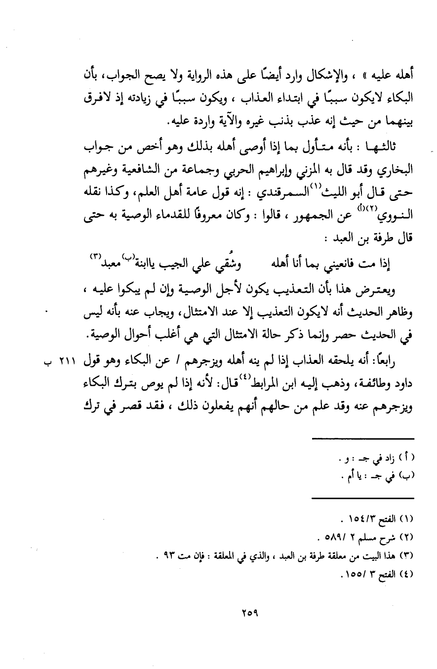 ثالثها: بأنه متأول بما إذا أوصى أهله بذلك وهو أخص من جواب البخاري وقد قال به المزني وإبراهيم الحربي وجماعة من الشافعية وغيرهم حتى قال أبو الليث (¬1) السمرقندي: إنه قول عامة أهل العلم، وكذا نقله النووي (¬2) (أ) عن الجمهور، قالوا: وكان معروفًا للقدماء الوصية به حتى قال طرفة بن العبد: