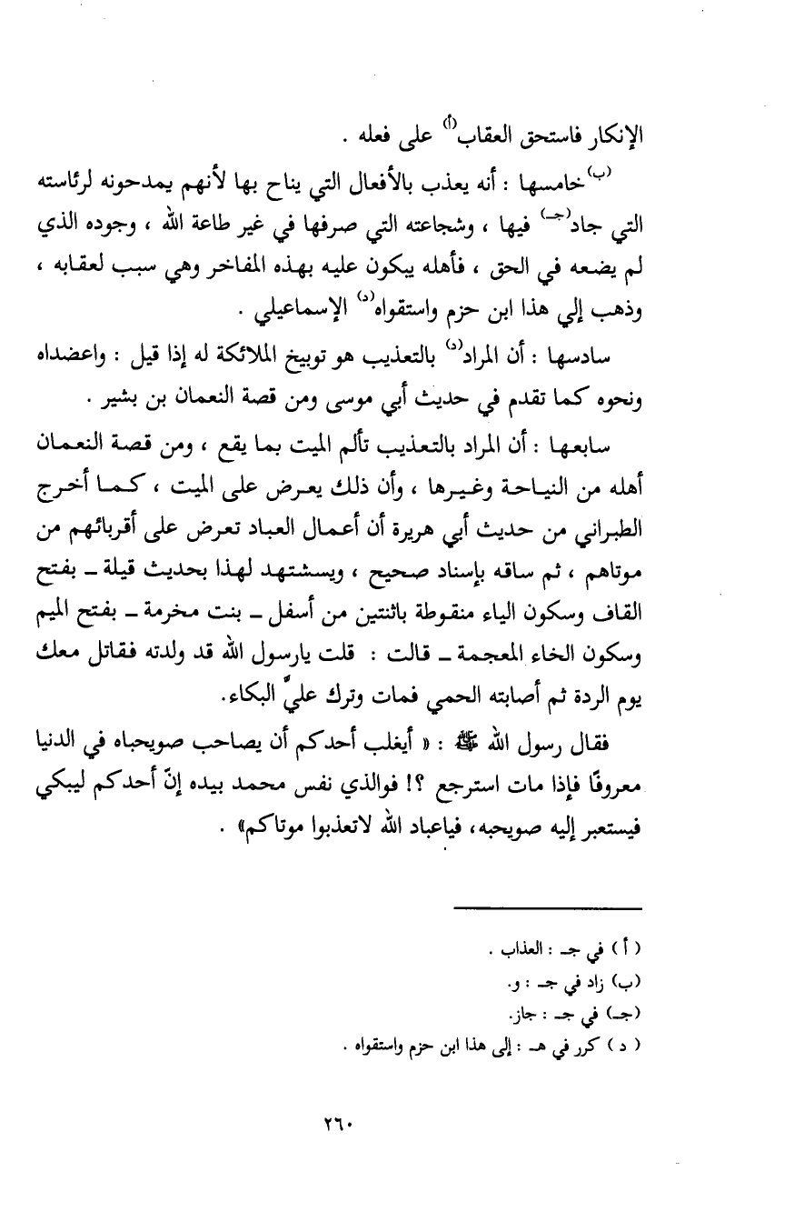 (ب) خامسها: أنه يعذب بالأفعال التي يناح بها لأنهم يمدحونه لرئاسته التي جاد (جـ) فيها، وشجاعته التي صرفها في غير طاعة الله، وجوده الذي لم يضعه في الحق، فأهله يبكون عليه بهذه المفاخر وهي سبب لعقابه، وذهب إلي هذا ابن حزم واستقواه (د) الإسماعيلي.