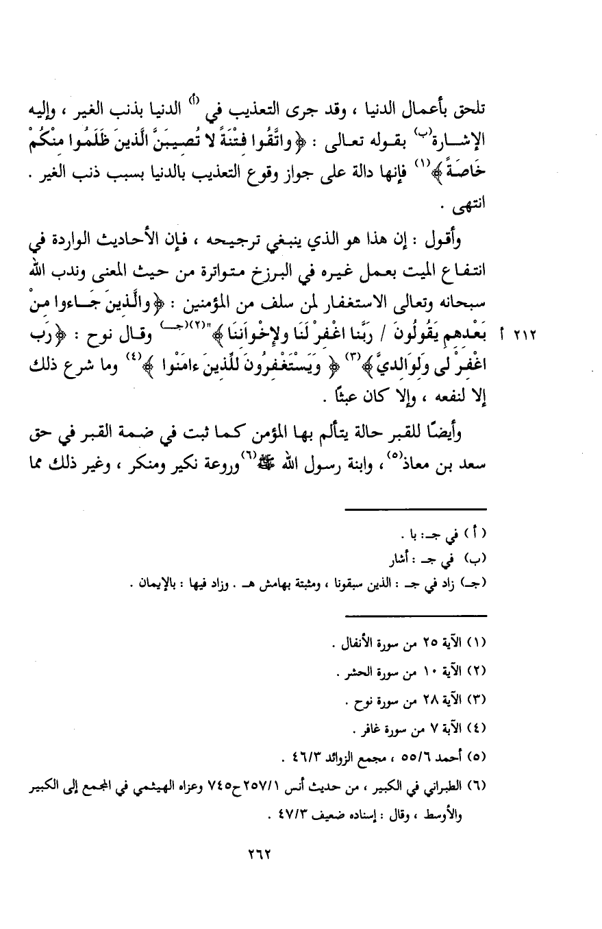 تلحق بأعمال الدنيا، وقد جرى التعذيب في (أ) الدنيا بذنب الغير، وإليه الإشارة (ب) بقوله تعالى: {وَاتَّقُوا فِتْنَةً لَا تُصِيبَنَّ الَّذِينَ ظَلَمُوا مِنْكُمْ خَاصَّةً} (¬1) فإنها دالة على جواز وقوع التعذيب بالدنيا بسبب ذنب الغير. انتهى.