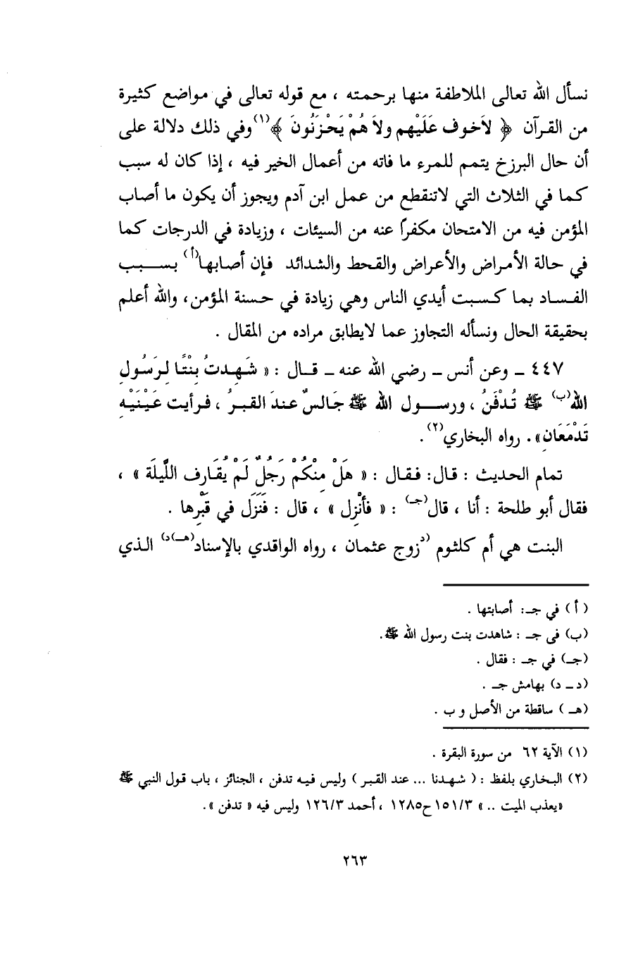 (¬2) البخاري بلفظ: (شهدنا ... عند القبر) وليس فيه تدفن، الجنائز، باب قول النبي - صلى الله عليه وسلم - "يعذب الميت .. " 3/ 151 ح 1285، أحمد 3/ 126 وليس فيه "تدفن".