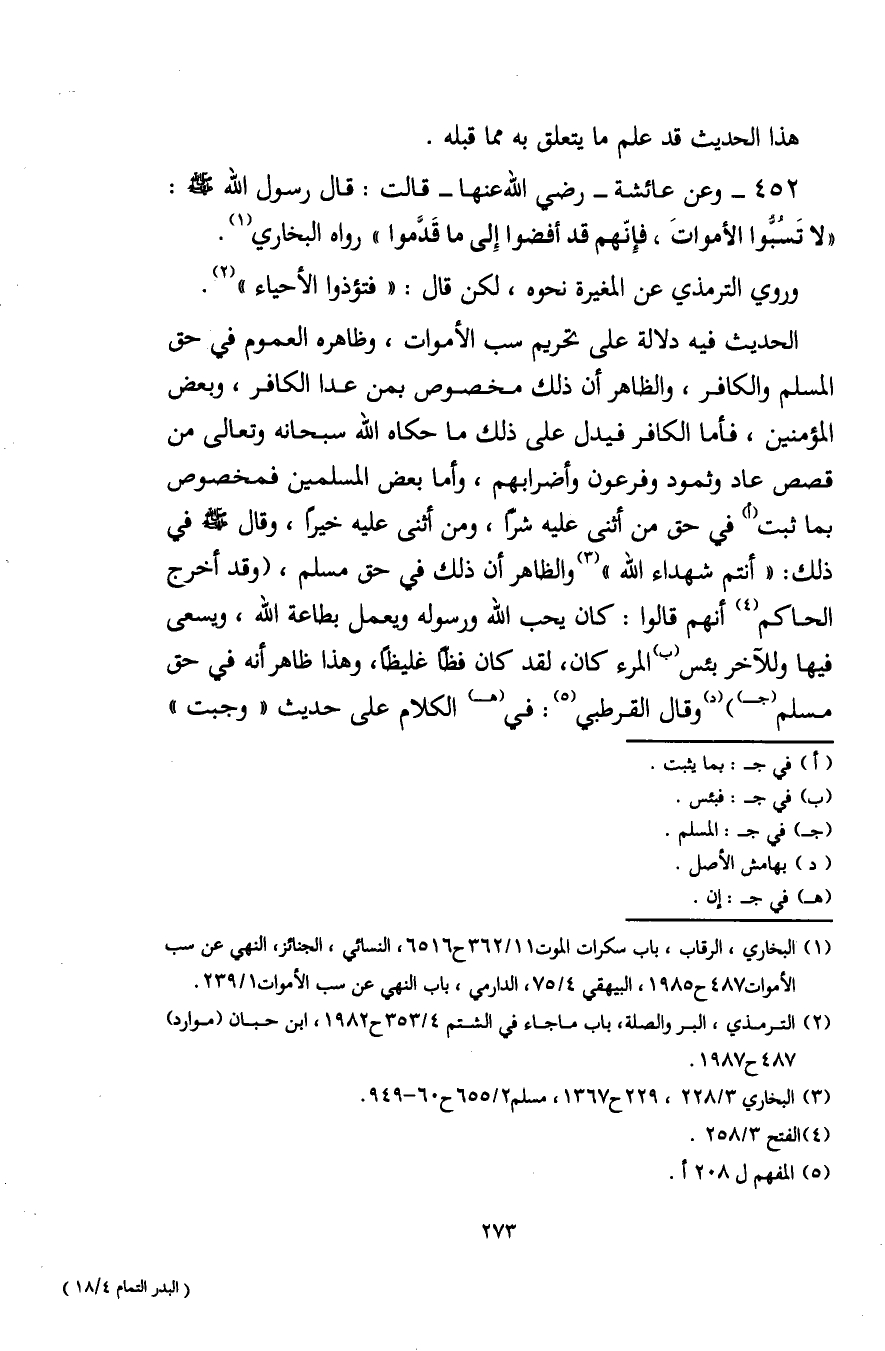 (¬1) البخاريّ، الرقاب، باب سكرات الموت 11/ 362 ح 6516، النسائي، الجنائز، النهي عن سب الأموات 487 ح 1985، البيهقي 4/ 75، الدارمي، باب النّهي عن سب الأموات 1/ 239.