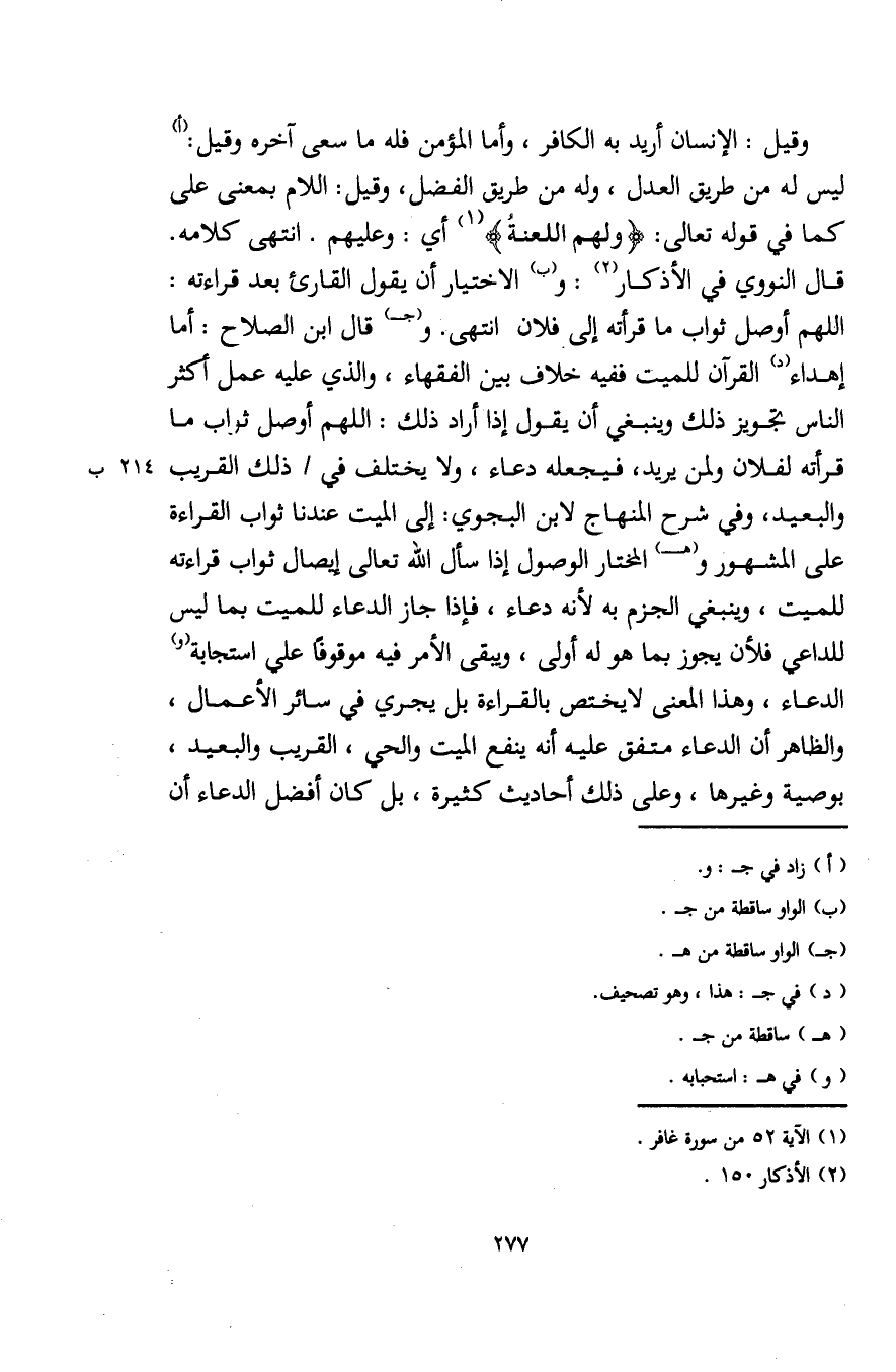 وقيل: الإنسان أريد به الكافر، وأما المؤمن فله ما سعى آخره وقيل: (أ) ليس له من طريق العدل، وله من طريق الفضل، وقيل: اللام بمعنى على كما في قوله تعالى: {وَلَهُمْ اللَّعَنَةُ} (¬1) أي: وعليهم. انتهى كلامه. قال النووي في الأذكار (¬2): و (ب) الاختيار أنّ يقول القارئ بعد قراءته: اللَّهُمَّ أوصل ثواب ما قرأته إلى فلان انتهى. و (جـ) قال ابن الصلاح: أنها إهداء (د) القرآن للميت ففيه خلاف بين الفقهاء، والذي عليه عمل أكثر النَّاس تجويز ذلك وينبغي أنّ يقول إذا أراد ذلك: اللَّهُمَّ أوصل ثواب ما قرأته لفلان ولمن يريد، فيجعله دعاء، ولا يختلف في ذلك القريب والبعيد، وفي شرح المنهاج لابن البجوي: إلى الميِّت عندنا ثواب القراءة على المشهور و (هـ) المختار الوصول إذا سأل الله تعالى إيصال ثواب قراءته للميت، وينبغي الجزم به لأنه دعاء، فإذا جاز الدُّعاء للميت بما ليس للداعي فلأن يجوز بما هو له أولى، ويبقى الأمر فيه موقوفًا علي استجابة (و) الدُّعاء، وهذا المعنى لا يختص بالقراءة بل يجري في سائر الأعمال، والظاهر أنّ الدُّعاء متفق عليه أنه ينفع الميِّت والحي، القريب والبعيد، بوصية وغيرها، وعلى ذلك أحاديث كثيرة، بل كان أفضل الدُّعاء أنّ