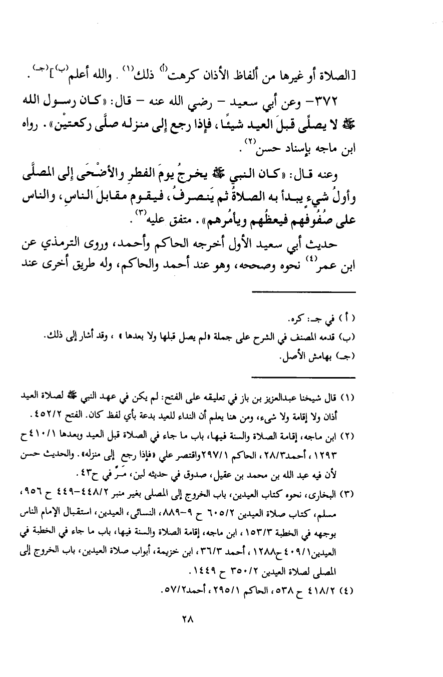 372 - وعن أبي سعيد - رضي الله عنه - قال: "كان رسول الله - صلى الله عليه وسلم - لا يصلِّي قبل العيد شيئًا، فإِذا رجع إِلى منزله صلَّى ركعتيْن". رواه ابن ماجه بإسناد حسن (¬2).