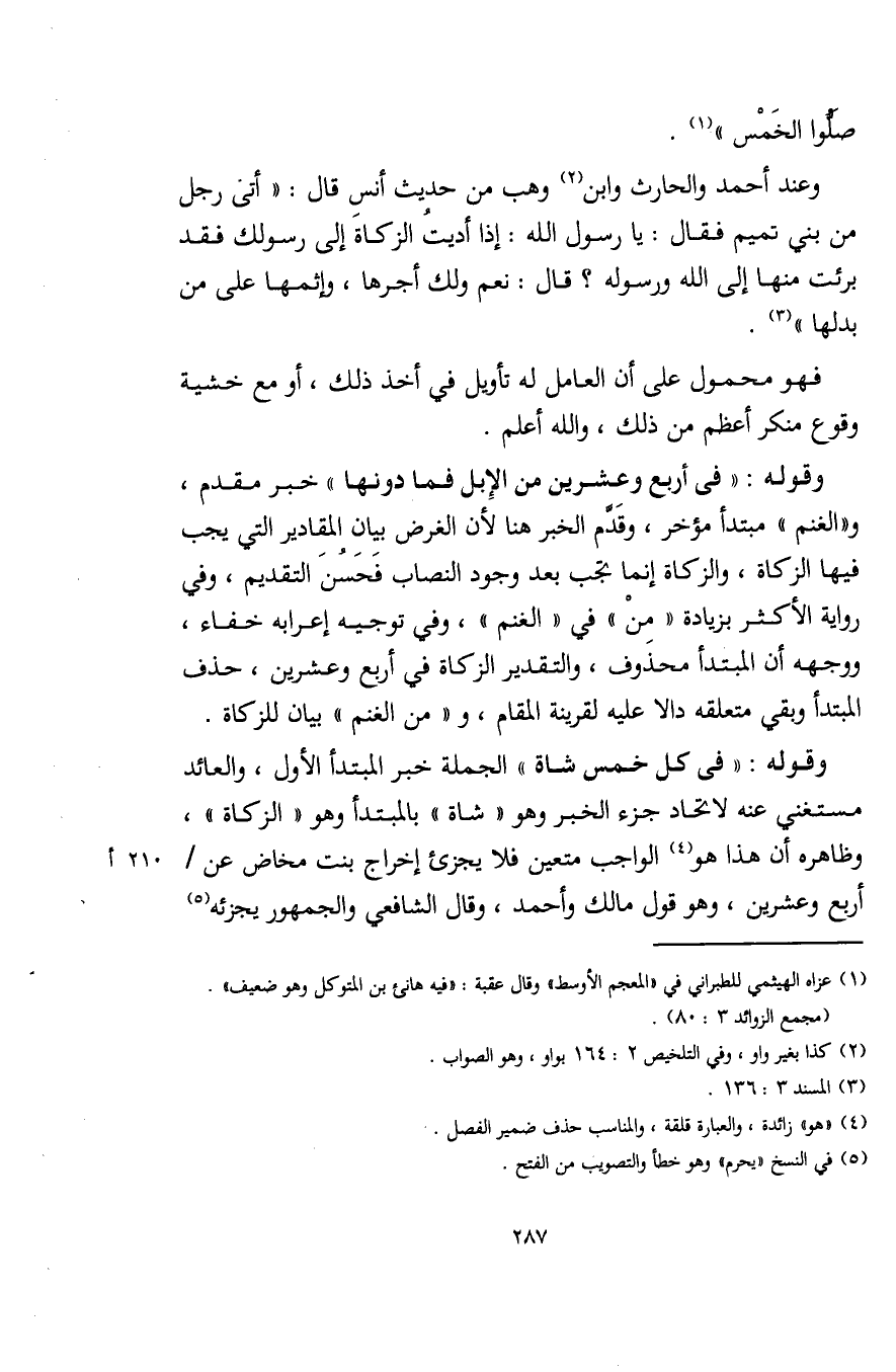 وقوله: "في كلّ خمس شاة" الجملة خبر المبتدأ الأوّل، والعائد مستغني عنه لاتحاد جزء الخبر وهو "شاة" بالمبتدأ وهو "الزَّكاة"، وظاهره أنّ هذا هو (¬4) الواجب متعين فلا يجزئ إخراج بنت مخاض عن أربع وعشرين، وهو قول مالك وأحمد، وقال الشّافعيّ والجمهور يجزئه (¬5)