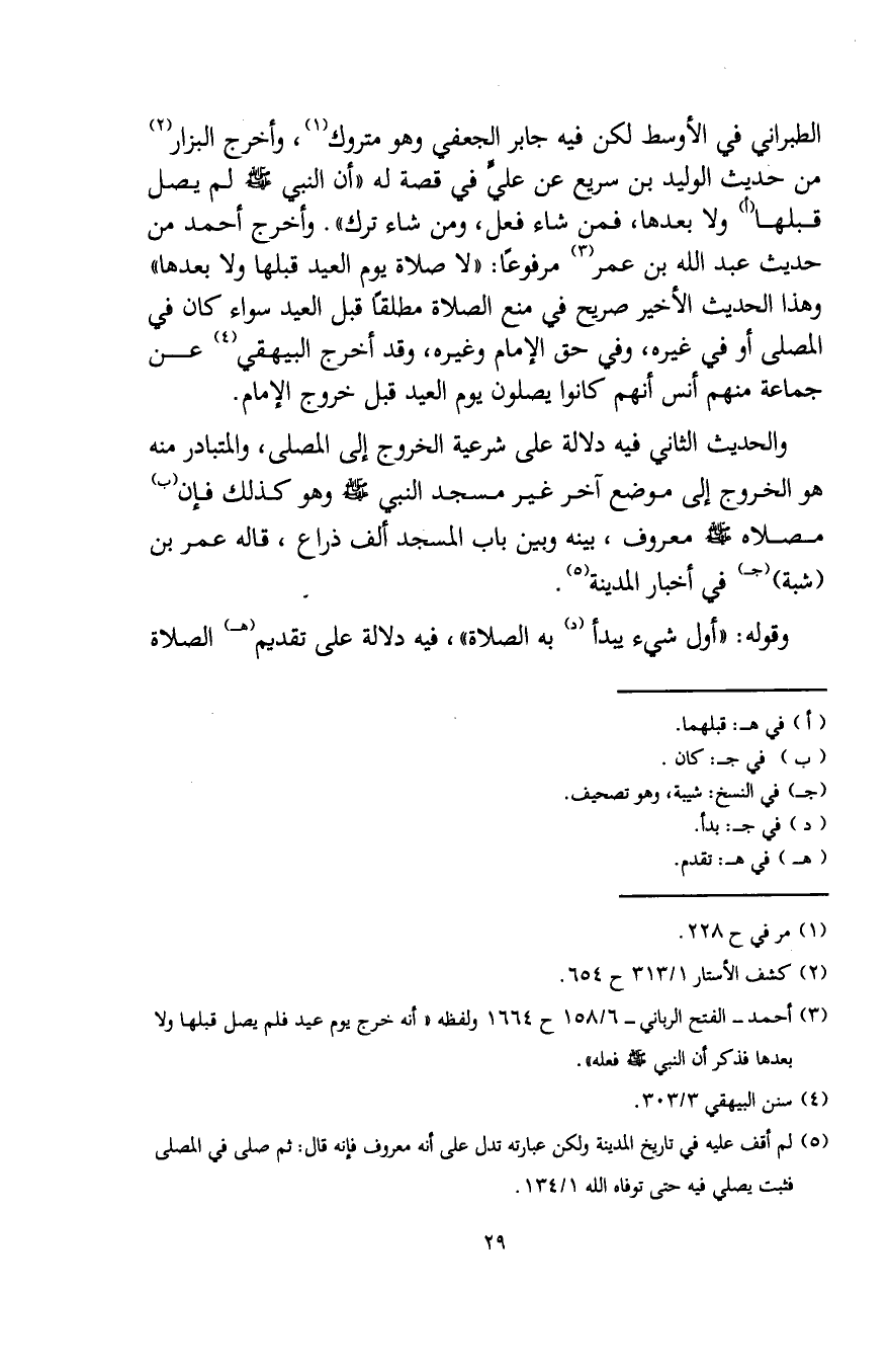 الطبراني في الأوسط لكن فيه جابر الجعفي وهو متروك (¬1)، وأخرج البزار (¬2) من حديث الوليد بن سريع عن عليٍّ في قصة له "أن النبي - صلى الله عليه وسلم - لم يصل قبلها (أ) ولا بعدها، فمن شاء فعل، ومن شاء ترك". وأخرج أحمد من حديث عبد الله بن عمر (¬3) مرفوعًا: "لا صلاة يوم العيد قبلها ولا بعدها" وهذا الحديث الأخير صريح في منع الصلاة مطلقًا قبل العيد سواء كان في المصلى أو في غيره، وفي حق الإمام وغيره، وقد أخرج البيهقي (¬4) عن جماعة منهم أنس أنهم كانوا يصلون يوم العيد قبل خروج الإمام.