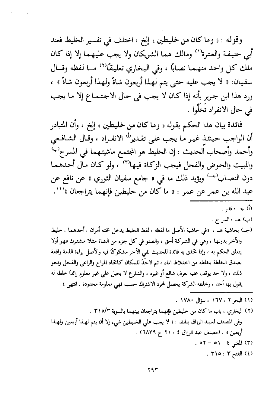 (جـ) بحاشية هـ: "في حاشية الأصل ما لفظه: لفظ الخليط يدخل تحته أمران: أحدهما: خليط والآخر بدونها، وهي في الشركة أحق، والصنو في كلّ جزء من الشاة مثلًا مشترك فهو أولًا يتعلّق الحكم به، وإذا تحقق به فائدة للحديث نفي الآخر مشكوكًا فيه والأصل براءة الذِّمَّة واقعة بصدق الخلطة بخلطه من اختلاط الماء، ثمّ لا حَدّ للمكان كاتحاد المراح والراعى والفحل ونحو ذلك، ولا حد يوقف عليه لعرف شائع أو غيره، والشارع لا يحيل على غير معلوم رائدًا، خلطه له يقول بها أحد، وخلطه الشركة يحصل لمجرد الاشتراك حسب فهي معلومة محدودة. انتهى".