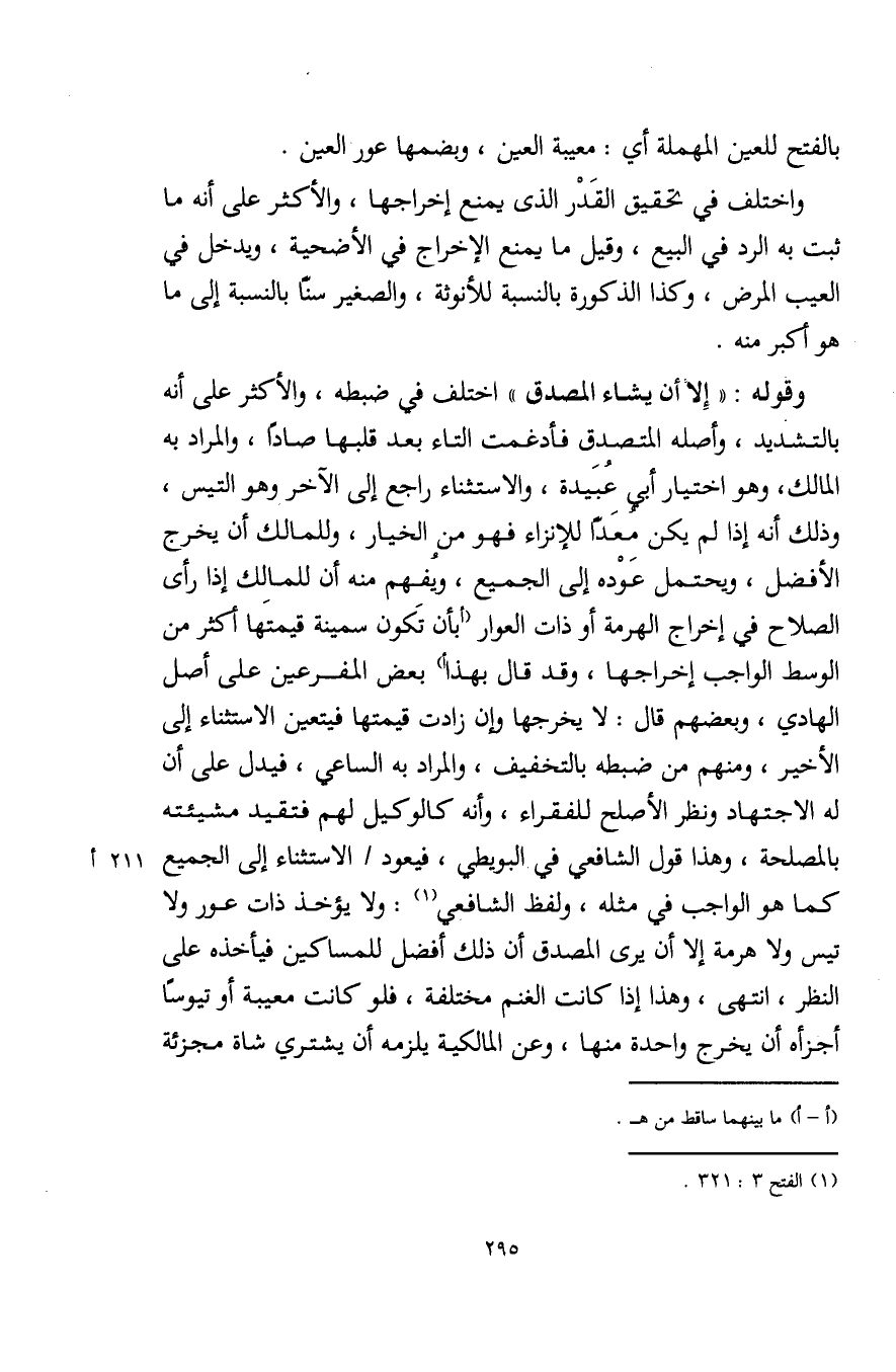 واختلف في تحقيق القَدْر الذي يمنع إخراجها، والأكثر على أنه ما ثبت به الرَّدّ في البيع، وقيل ما يمنع الإخراج في الأضحية، ويدخل في العيب المرض، وكذا الذكورة بالنسبة للأنوثة، والصغير سنًّا بالنسبة إلى ما هو أكبر منه.