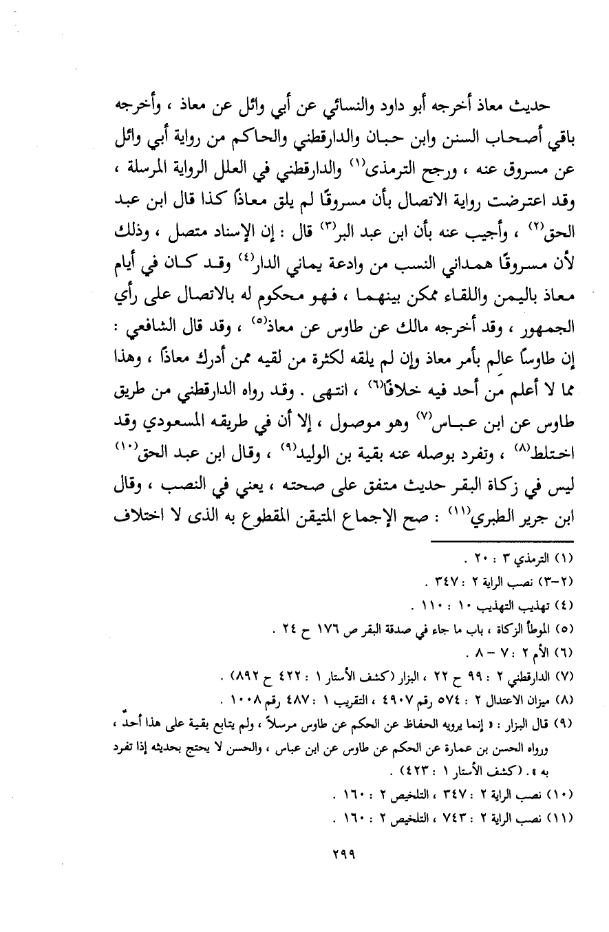 حديث معاذ أخرجه أبو داود والنَّسائيُّ عن أبي وائل عن معاذ، وأخرجه باقي أصحاب السنن وابن حبّان والدارقطني والحاكم من رواية أبي وائل عن مسروق عنه، ورجح الترمذي (¬1) والدارقطني في العلل الرِّواية المرسلة، وقد اعترضت رواية الاتصال بأن مسروقًا لم يلق معاذًا كذا قال ابن عبد الحق (¬2)، وأجيب عنه بأن ابن عبد البر (¬3) قال: إن الإسناد متصل، وذلك لأن مسروقًا همداني النسب من وادعة يماني الدَّار (¬4) وقد كان في أيّام معاذ باليمن واللقاء ممكن بينهما، فهو محكوم له بالاتصال على رأي الجمهور، وقد أخرجه مالك عن طاوس عن معاذ (¬5)، وقد قال الشّافعيّ: إن طاوسًا عالم بأمر معاذ وإن لم يلقه لكثرة من لقيه ممّن أدرك معاذًا، وهذا ممّا لا أعلم مَنْ أحد فيه خلافًا (¬6)، انتهى. وقد رواه الدارقطني من طريق طاوس عن ابن عبّاس (¬7) وهو موصول، إلا أنّ في طريقه المسعودي وقد اختلط (¬8)، وتفرد بوصله عنه بقية بن الوليد (¬9)، وقال ابن عبد الحق (¬10) ليس في زكاة البقر حديث متفق على صحته، يعني في النصب، وقال ابن جرير الطّبريّ (¬11): صح الإجماع المتيقن المقطوع به الذي لا اختلاف
