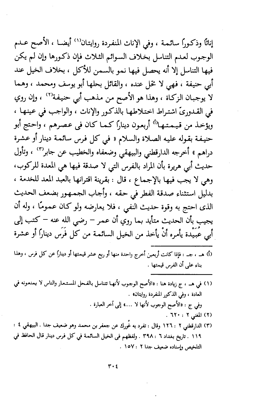 (¬3) الدارقطني 2: 126 وقال: تفرد به غُورك عن جعفر بن محمّد وهو ضعيف جدًّا. البيهقي 4: 119. تاريخ بغداد 6: 398. ولفظهم في الخيل السائمة في كلّ فرس دينار قال الحافظ في التلخيص وإسناده ضعيف جدًّا 2: 157.