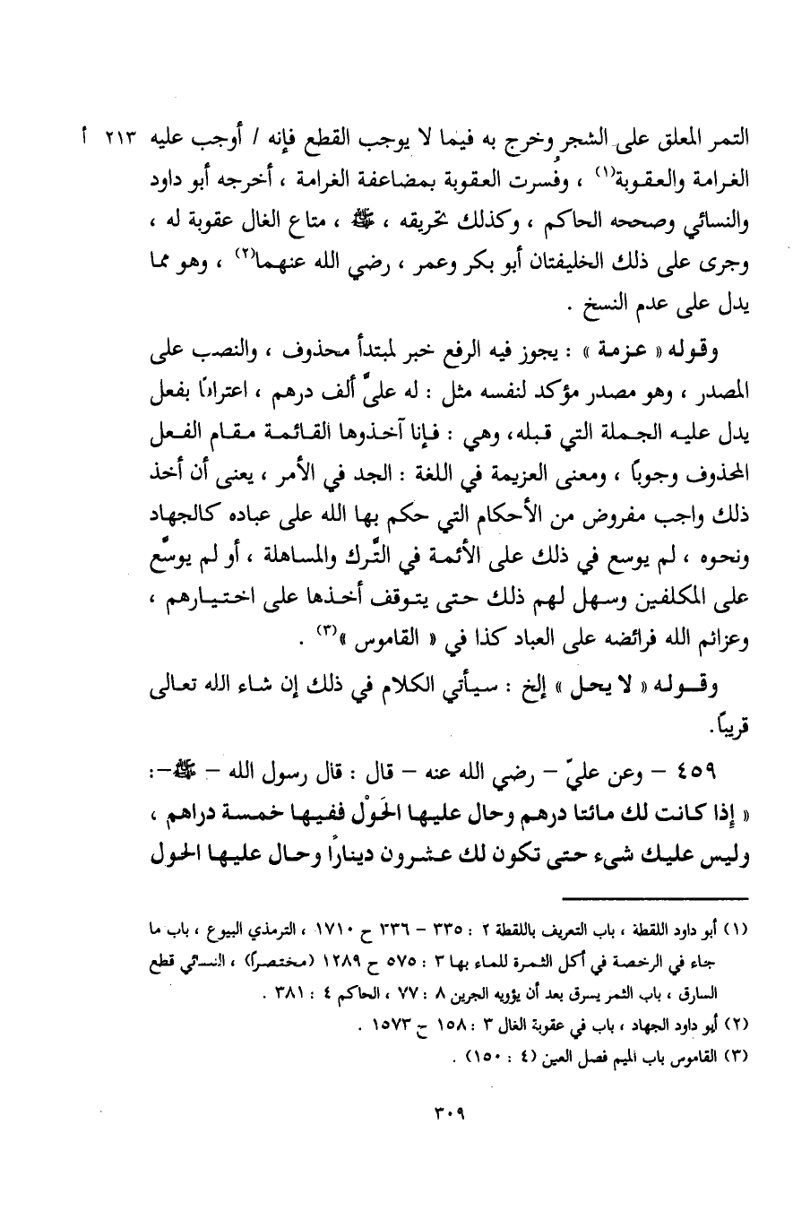 التّمر المعلق على الشجر وخرج به فيما لا يوجب القطع فإنّه أوجب عليه الغرامة والعقوبة (¬1)، وفُسرت العقوبة بمضاعفة الغرامة، أخرجه أبو داود والنَّسائيّ وصححه الحاكم، وكذلك تحريقه، - صلى الله عليه وسلم -، متاع الغال عقوبة له، وجرى على ذلك الخليفتان أبو بكر وعمر، رضي الله عنهما (¬2)، وهو ممّا يدلُّ على عدم النسخ.