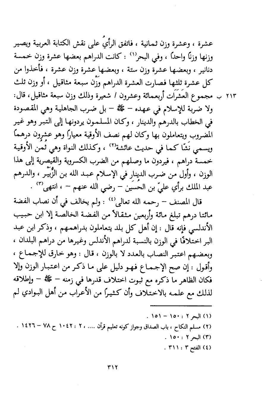 قال المصنِّف -رحمه الله تعالى (¬4): ولم يخالف في أنّ نصاب الفضة مائتا درهم تبلغ مائة وأربعين مثقالًا من الفضة الخالصة إلا ابن حبيب الأندلسي فإنّه قال: إن أهل كلّ بلد يتعاملون بدراهمهم، وذكر ابن عبد البرّ اختلافًا في الوزن بالنسبة لدراهم الأندلس وغيرها من دراهم البلدان، وبعضهم اعتبر النصاب بالعدد لا بالوزن، قال: وهو خارق للإجماع، وأقول: إن صح الإجماع فهو دليل على ما ذكر من اعتبار الوزن وإلا فكان الظّاهر ما ذكره مع ثبوت اختلاف قدرها في زمنه - صلى الله عليه وسلم - وإطلاقه لذلك مع علمه بالاختلاف وأن كثيرًا من الإعراب من أهل البوادي لم