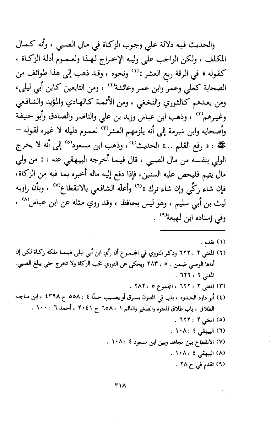 (¬2) المغني 2: 622 وذكر النووي في المجموع أنّ رأي ابن أبي ليلى فيما ملكه زكاة لكن إن أداها الوصي ضمن. 5: 283 ويحكى عن النووي تجب الزَّكاة ولا تخرج حتّى يبلغ الصبي. المغني 2: 622.