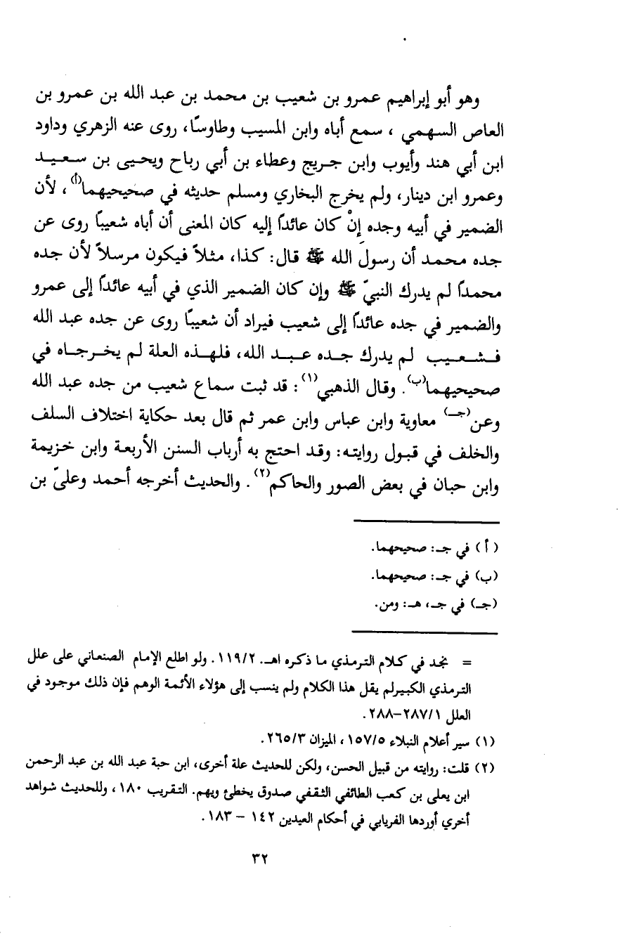 وهو أبو إبراهيم عمرو بن شعيب بن محمد بن عبد الله بن عمرو بن العاص السهمي، سمع أباه وابن المسيب وطاوسًا، روى عنه الزهري وداود ابن أبي هند وأيوب وابن جريج وعطاء بن أبي رباح ويحيى بن سعيد وعمرو ابن دينار، ولم يخرج البخاري ومسلم حديثه في صحيحيهما (أ)؛ لأن الضمير في أبيه وجده إِنْ كان عائدًا إليه كان المعنى أن أباه شعيبًا روى عن جده محمد أن رسول الله - صلى الله عليه وسلم - قال: كذا، مثلًا فيكون مرسلًا لأن جده محمدًا لم يدرك النبي - صلى الله عليه وسلم - وإن كان الضمير الذي في أبيه عائدًا إلى عمرو والضمير في جده عائدًا إلى شعيب فيراد أن شعيبًا روى عن جده عبد الله فشعيب لم يدرك جده عبد الله، فلهذه العلة لم يخرجاه في صحيحيهما (ب). وقال الذهبي (¬1): قد ثبت سماع شعيب من جده عبد الله وعن (جـ) معاوية وابن عباس وابن عمر ثم قال بعد حكاية اختلاف السلف والخلف في قبول روايته: وقد احتج به أرباب السنن الأربعة وابن خزيمة وابن حبان في بعض الصور والحاكم (¬2). والحديث أخرجه أحمد وعليّ بن
