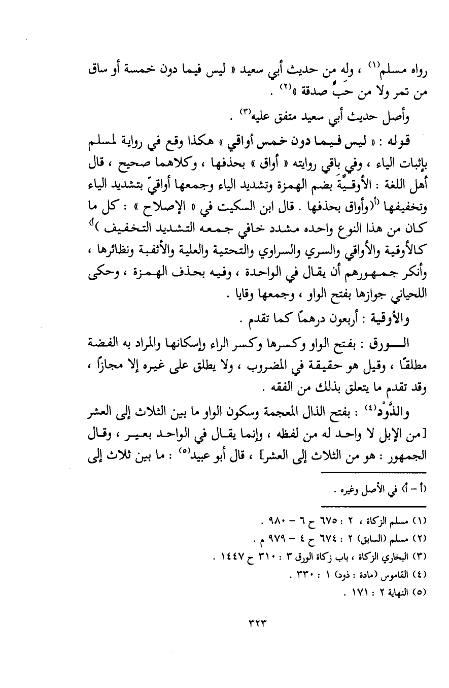 قوله: "ليس فيما دون خمس أواقي" هكذا وقع في رواية لمسلم بإثبات الياء، وفي باقي روايته "أواق" بحذفها، وكلاهما صحيح، قال أهل اللغة: الأوقيَّةَ بضم الهمزة وتشديد الياء وجمعها أواقيّ بتشديد الياء وتخفيفها (أ (وأواق بحذفها. قال ابن السكيت في "الإصلاح": كل ما كان من هذا النوع واحده مشدد خافي جمعه التشديد التخفيف) أ) كالأوقية والأواقي والسري والسراوي والتحتية والعلية والأثفبة ونظائرها، وأنكر جمهورهم أن يقال في الواحدة، وفيه بحذف الهمزة، وحكى اللحياني جوازها بفتح الواو، وجمعها وقايا.