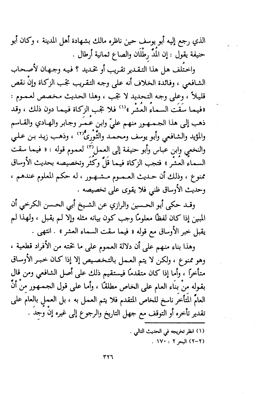 وهذا بناء منهم على أن دلالة العموم على ما تحته من الأفراد قطعية، وهو ممنوع، ولكن لا يتم العمل بالتخصيص إلا إذا كان خبر الأوساق متأخرًا، وأما إذا كان متقدمًا فيستقيم ذلك على أصل الشافعي ومن قال بقوله مِنْ بِنَاء العام على الخاص مطلقًا، وأما على قول الجمهور منْ أنَّ العامَّ المَتأخر ناسخ للخاص المتقدم فلا ينم العمل به، بل العمل بالعام على تقدير تأخره أو التوقف مع جهل التاريخ والرجوع إلى غيره إنْ وُجِدَ.