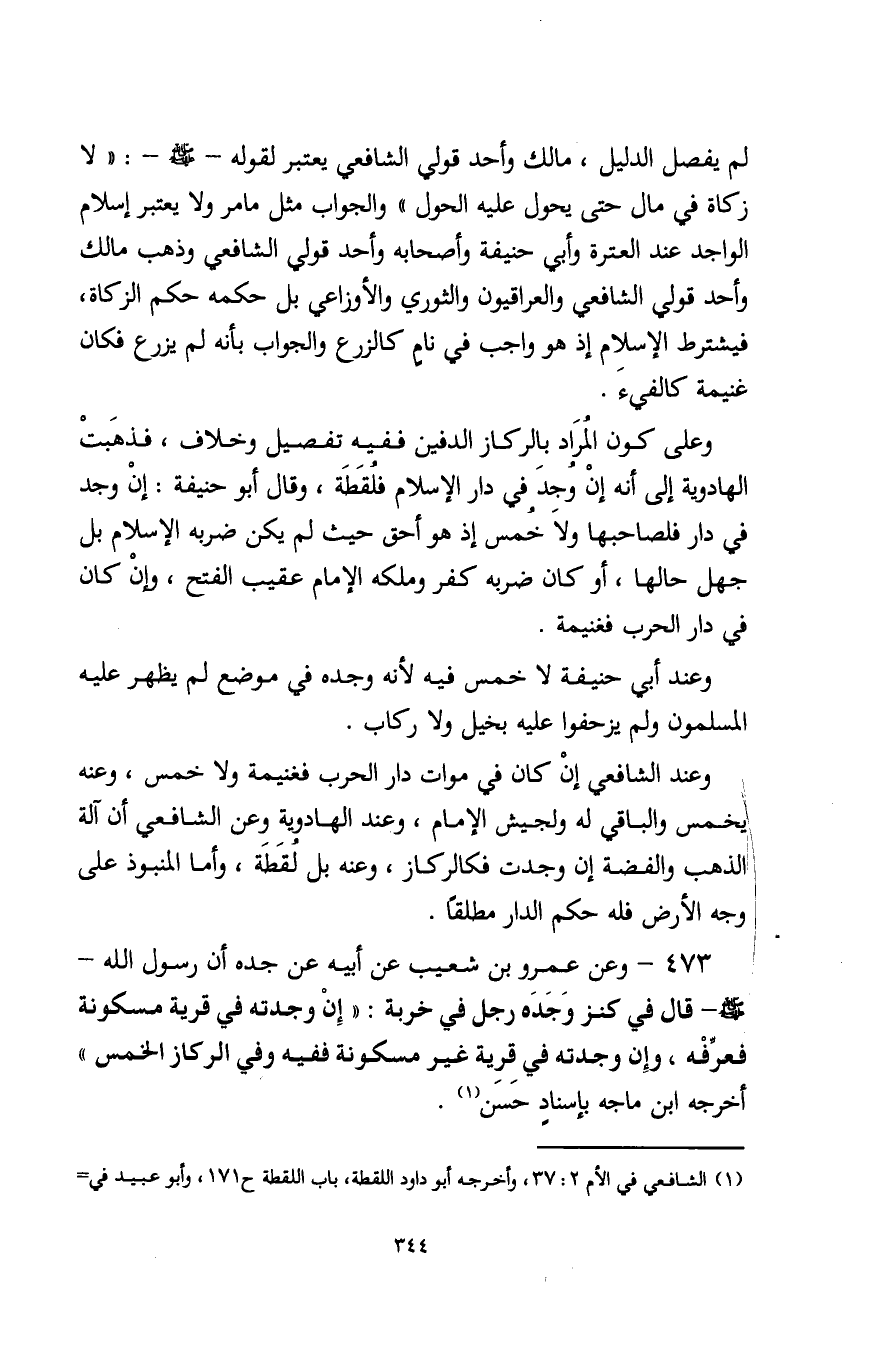 473 - وعن عمرو بن شعيب عن أبيه عن جده أن رسول الله - صلى الله عليه وسلم - قال في كنز وَجَدَه رجل في خربة: "إِنْ وجدته في قرية مسكونة فعرِّفْه، وإن وجدته في قرية غير مسكونة ففيه وفي الركاز الخمس" أخرجه ابن ماجه بإسنادٍ حسن (¬1).