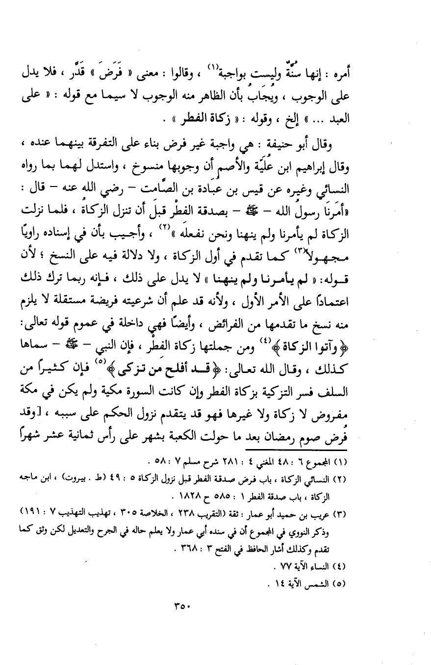 وقال أبو حنيفة: هي واجبة غير فرض بناء على التفرقة بينهما عنده، وقال إبراهيم بن عُلَيّة والأصم أن وجوبها منسوخ، واستدل لهما بما رواه النسائي وغيره عن قيس بن عُبَادة بن الصَّامت - رضي الله عنه - قال: "أمَرنَا رسول الله - صلى الله عليه وسلم - بصدقة الفطرْ قبلَ أن تنزل الزكاةُ، فلما نزلت الزكاة لم يأمرنا ولم ينهنا ونحن نفعله" (¬2)، وأجيب بأن في إسناده راويًا مجهولًا (¬3) كما تقدم في أول الزكاة، ولا دلالة فيه على النسخ؛ لأن قوله: "لم يأمرنا ولم ينهنا" لا يدل على ذلك، فإنه ربما ترك ذلك اعتمادًا على الأمر الأول، ولأنه قد علم أن شرعيته فريضة مستقلة لا يلزم منه نسخ ما تقدمها من الفرائض، وأيضَا فهي داخلة في عموم قوله تعالى: {وَآتُوا الزَّكَاةَ} (¬4) ومن جملتها زكاة الفِطرْ، فإن النبي - صلى الله عليه وسلم - سماها كذلك، وقال الله تعالى: {قَدْ أَفْلَحَ مَنْ تَزَكَّى} (¬5) فإن كثيرًا من السلف فسر التزكية بزكاة الفطر وإن كانت السورة مكية ولم يكن في مكة بفروض لا زكاة ولا غيرها فهو قد يتقدم نزول الحكم على سببه، [وقد فرض صوم رمضان بعد ما حولت الكعبة بشهر على رأس ثمانية عشر شهرًا