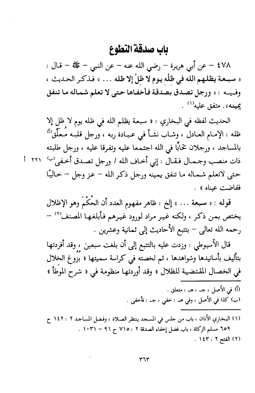 (¬1) البخاري الأذان، باب من جلس في المسجد ينتظر الصلاة، وفضل المساجد 2: 142 ح 659 مسلم الزكاة، باب فضل إخفاء الصدقة 2: 715 ح 91 - 1031.