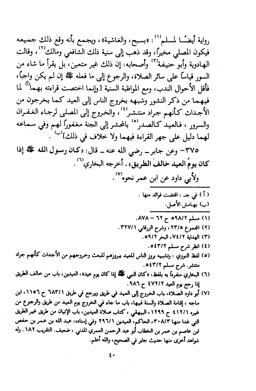 375 - وعن جابر - رضي الله عنه - قال: "كان رسول الله - صلى الله عليه وسلم - إِذا كان يومُ العيد خالفَ الطريق". أخرجه البخاري (¬6).