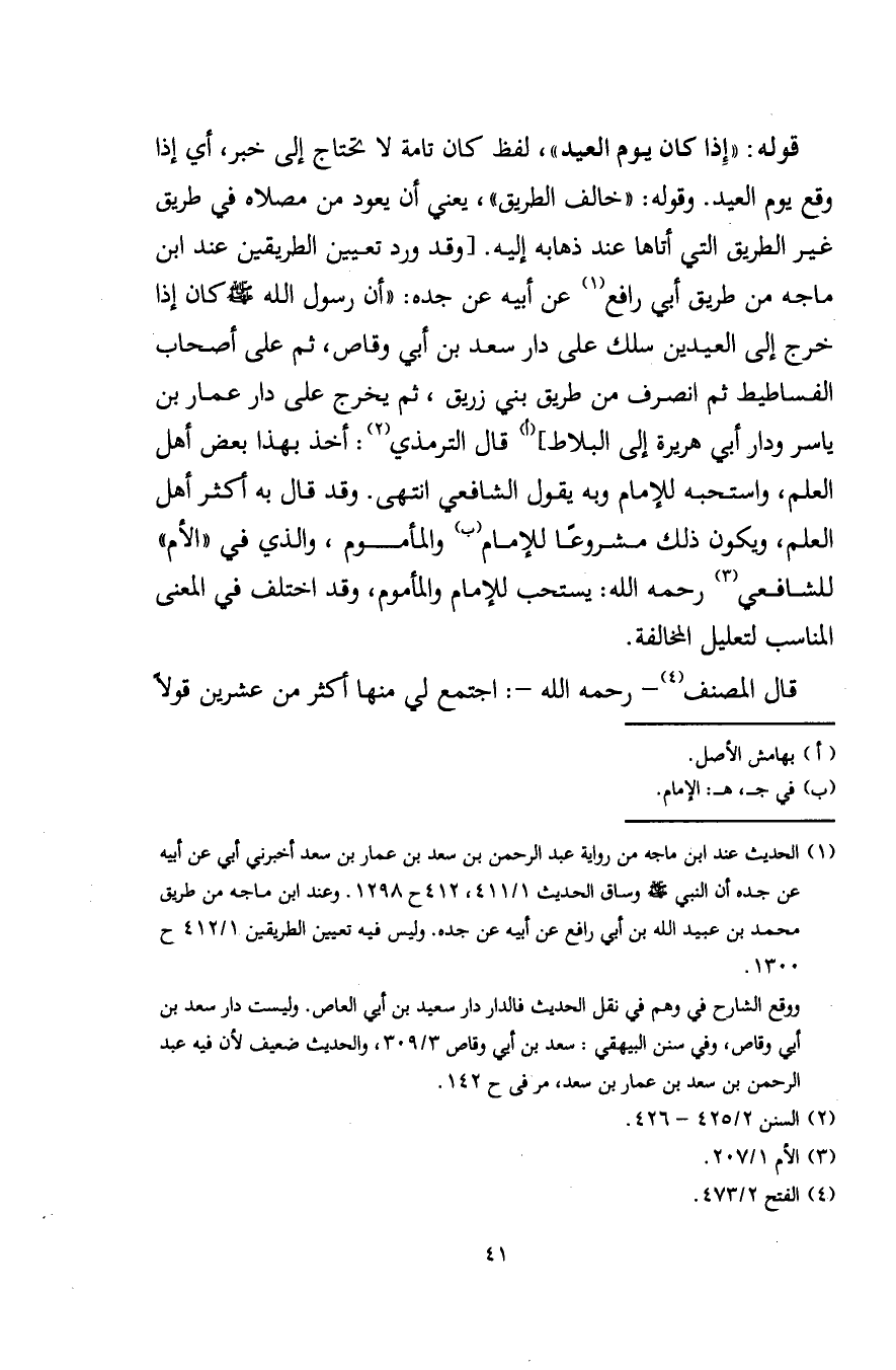 قوله: "إِذا كان يوم العيد"، لفظ كان تامة لا تحتاج إلى خبر، أي إذا وقع يوم العيد. وقوله: "خالف الطريق"، يعني أن يعود من مصلاه في طريق غير الطريق التي أتاها عند ذهابه إليه. [وقد ورد تعيين الطريقين عند ابن ماجه من طريق أبي رافع (¬1) عن أبيه عن جده: "أن رسول الله - صلى الله عليه وسلم - كان إذا خرج إلى العيدين سلك على دار سعد بن أبي وقاص، ثم على أصحاب الفساطيط ثم انصرف من طريق بني زريق، ثم يخرج على دار عمار بن ياسر ودار أبي هريرة إلى البلاط] (أ) قال الترمذي (¬2): أخذ بهذا بعض أهل العلم، واستحبه للإمام وبه يقول الشافعي انتهى. وقد قال به أكثر أهل العلم، ويكون ذلك مشروعًا للإمام (ب) والمأموم، والذي في "الأم" للشافعي (¬3) رحمه الله: يستحب للإمام والمأموم، وقد اختلف في المعنى المناسب لتعليل المخالفة.
