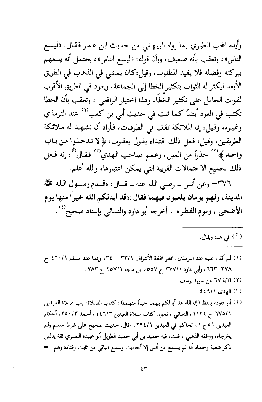 (¬4) أبو داود، بلفظ (إن الله قد أبدلكم بهما خيرًا منهما): كتاب الصلاة، باب صلاة العيدين 1/ 675 ح 1134، النسائي، نحوه: كتاب صلاة العيدين 3/ 146، أحمد 3/ 250، أحكام العيدين 51 ح 1، الحاكم في العيدين 1/ 294، وقال: حديث صحيح على شرط مسلم ولم يخرجاه، ووافقه الذهبي، قلت: فيه حميد بن أبي حميد الطويل أبو عبيدة البصري ثقة يدلس ذكر شعبة وحماد أنه لم يسمع من أنس إلا أحاديث وسمع الباقي من ثابت وقتادة وهم =