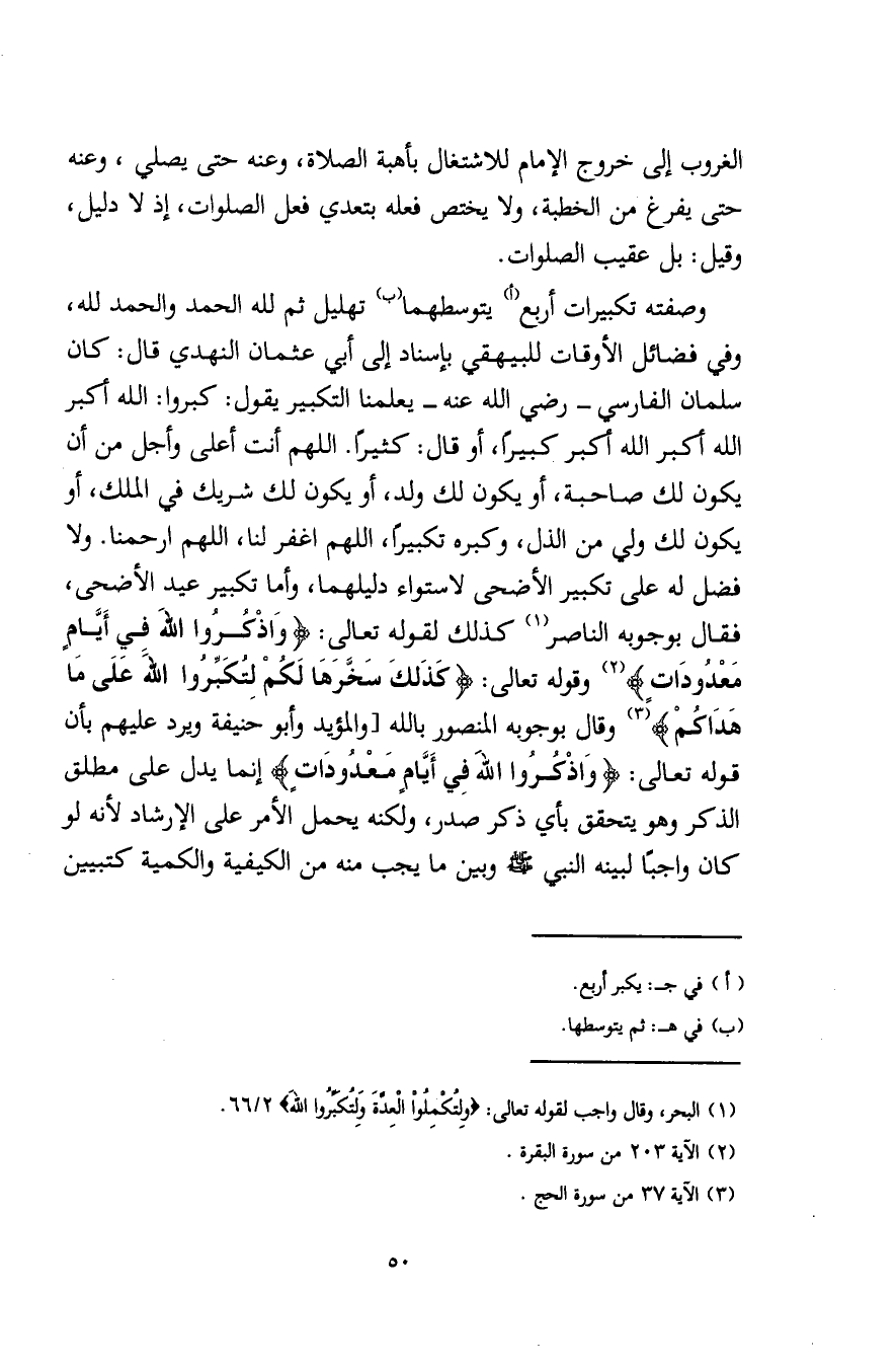 وصفته تكبيرات أربع (أ) يتوسطهما (ب) تهليل ثم لله الحمد والحمد لله، وفي فضائل الأوقات للبيهقي بإسناد إلى أبي عثمان النهدي قال: كان سلمان الفارسي - رضي الله عنه - يعلمنا التكبير يقول: كبروا: الله أكبر الله أكبر الله أكبر كبيرًا، أو قال: كثيرًا. اللهم أنت أعلى وأجل من أن يكون لك صاحبة، أو يكون لك ولد، أو يكون لك شريك في الملك، أو يكون لك ولي من الذل، وكبره تكبيرًا، اللهم اغفر لنا، اللهم ارحمنا. ولا فضل له على تكبير الأضحى لاستواء دليلهما، وأما تكبير عيد الأضحى، فقال بوجوبه الناصر (¬1) كذلك لقوله تعالى: {وَاذْكُرُوا اللَّهَ فِي أَيَّامٍ مَعْدُودَاتٍ} (¬2) وقوله تعالى: {كَذَلِكَ سَخَّرَهَا لَكُمْ لِتُكَبِّرُوا اللَّهَ عَلَى مَا هَدَاكُمْ} (¬3) وقال بوجوبه المنصور بالله [والمؤيد وأبو حنيفة ويرد عليهم بأن قوله تعالى: {وَاذْكُرُوا اللَّهَ فِي أَيَّامٍ مَعْدُودَاتٍ} إنما يدل على مطلق الذكر وهو يتحقق بأي ذكر صدر، ولكنه يحمل الأمر على الإرشاد لأنه لو كان واجبًا لبينه النبي - صلى الله عليه وسلم - وبين ما يجب منه من الكيفية والكمية كتبيين