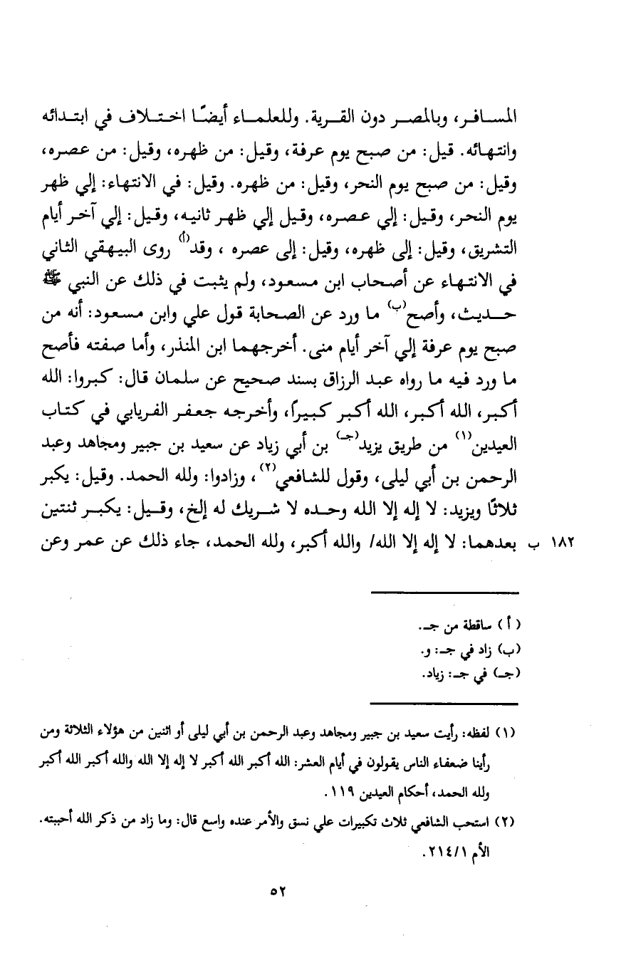 المسافر، وبالمصر دون القرية. وللعلماء أيضًا اختلاف في ابتدائه وانتهائه. قيل: من صبح يوم عرفة، وقيل: من ظهره، وقيل: من عصره، وقيل: من صبح يوم النحر، وقيل: من ظهره. وقيل: في الانتهاء: إلى ظهر يوم النحر، وقيل: إلى عصره، وقيل إلى ظهر ثانيه، وقيل: إلى آخر أيام التشريق، وقيل: إلى ظهره، وقيل: إلى عصره، وقد (أ) روى البيهقي الثاني في الانتهاء عن أصحاب ابن مسعود، ولم يثبت في ذلك عن النبي - صلى الله عليه وسلم - حديث، وأصح (ب) ما ورد عن الصحابة قول علي وابن مسعود: أنه من صبح يوم عرفة إلى آخر أيام منى. أخرجهما ابن المنذر، وأما صفته فأصح ما ورد فيه ما رواه عبد الرزاق بسند صحيح عن سلمان قال: كبروا: الله أكبر، الله أكبر، الله أكبر كبيرًا، وأخرجه جعفر الفريابي في كتاب العيدين (¬1) من طريق يزيد (جـ) بن أبي زياد عن سعيد بن جبير ومجاهد وعبد الرحمن بن أبي ليلى، وقول للشافعي (¬2)، وزادوا: ولله الحمد. وقيل: يكبر ثلاثًا ويزيد: لا إله إلا الله وحده لا شريك له إلخ، وقيل: يكبر ثنتين بعدهما: لا إله إلا الله والله أكبر، ولله الحمد، جاء ذلك عن عمر وعن