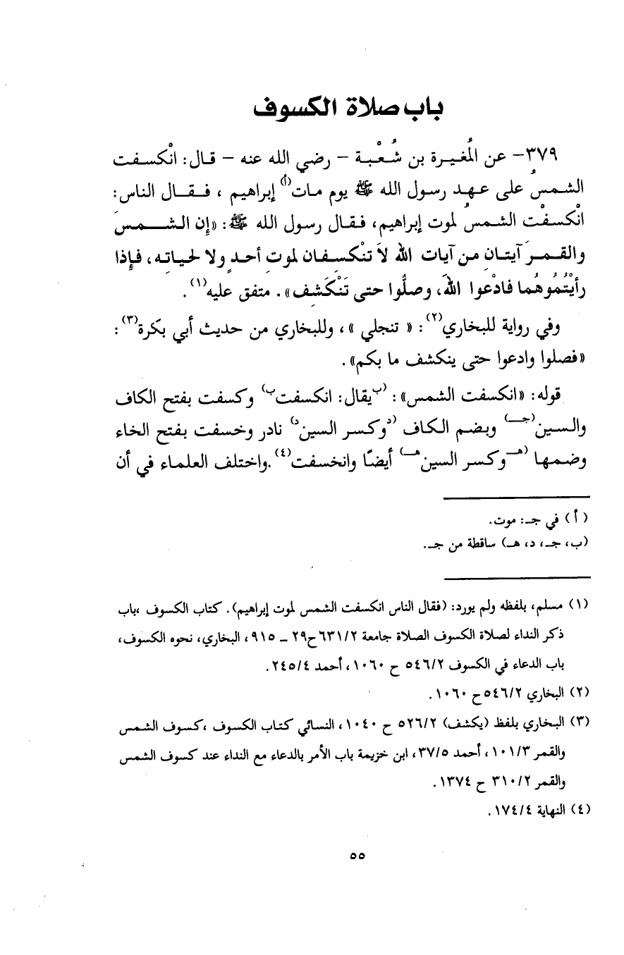 (¬3) البخاري بلفظ (يكشف) 2/ 526 ح 1040، النسائي كتاب الكسوف، كسوف الشمس والقمر 3/ 101، أحمد 5/ 37، ابن خزيمة باب الأمر بالدعاء مع النداء عند كسوف الشمس والقمر 2/ 310 ح 1374.