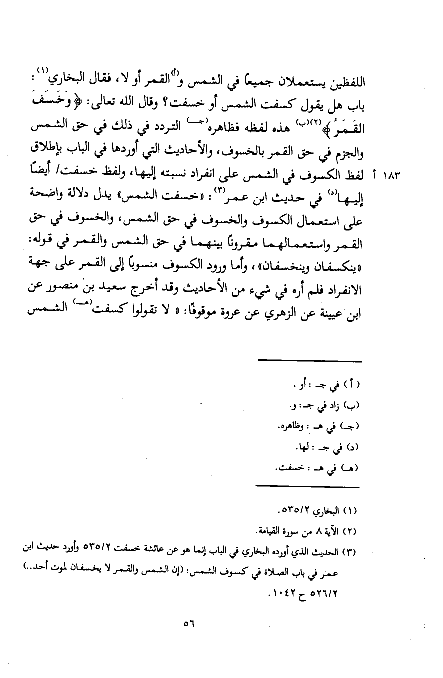 اللفظين يستعملان جميعًا في الشمس و (أ) القمر أو لا، فقال البخاري (¬1): باب هل يقول كسفت الشمس أو خسفت؟ وقال الله تعالى: {وَخَسَفَ الْقَمَرُ (8)} (¬2) (ب) هذه لفظه فظاهره (جـ) التردد في ذلك في حق الشمس والجزم في حق القمر بالخسوف، والأحاديث التي أوردها في الباب بإطلاق لفظ الكسوف في الشمس على انفراد نسبته إليها، ولفظ خسفت أيضًا إليها (د) في حديث ابن عمر (¬3): "خسفت الشمس" يدل دلالة واضحة على استعمال الكسوف والخسوف في حق الشمس، والخسوف في حق القمر واستعمالهما مقرونًا بينهما في حق الشمس والقمر في قوله: "ينكسفان وينخسفان"، وأما ورود الكسوف منسوبًا إلى القمر على جهة الانفراد فلم أره في شيء من الأحاديث وقد أخرج سعيد بن منصور عن ابن عيينة عن الزهري عن عروة موقوفًا: "لا تقولوا كسفت (هـ) الشمس
