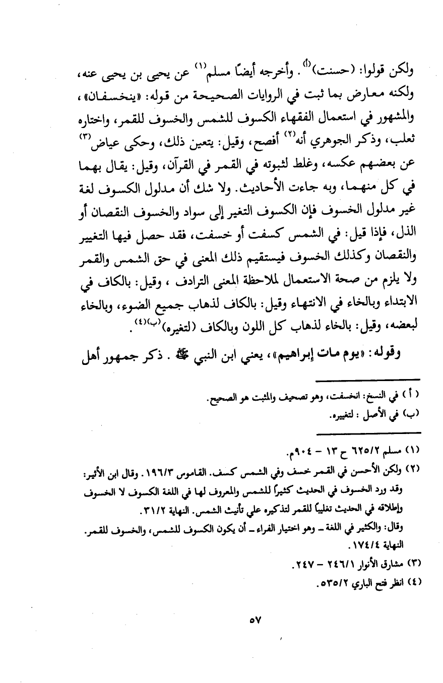 (¬2) ولكن الأحسن في القمر خسف وفي الشمس كسف. القاموس 3/ 196. وقال ابن الأثير: وقد ورد الخسوف في الحديث كثيرًا للشمس والمعروف لها في اللغة الكسوف لا الخسوف وإطلاقه في الحديث تغليبًا للقمر لتذكيره على تأنيث الشمس. النهاية 2/ 31.