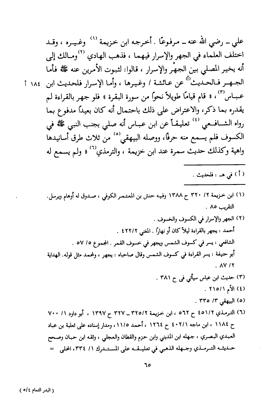 علي - رضي الله عنه - مرفوعًا. أخرجه ابن خزيمة (¬1) وغيره، وقد اختلف العلماء في الجهر والإسرار فيهما، فذهب الهادي (¬2) ومالك إلى أنه يخير المصلي بين الجهر والإسرار، قالوا: لثبوت الأمرين عنه - صلى الله عليه وسلم - فأما الجهر فالحديث (أ) عن عائشة وغيرها، وأما الإسرار فلحديث ابن عباس (¬3)، "قام قيامًا طويلًا نحوًا من سورة البقرة" فلو جهر بالقراءة لم يقدره بما ذكر، والاعتراض على ذلك باحتمال أنه كان بعيدًا مدفوع بما رواه الشافعي (¬4) تعليقًا عن ابن عباس أنه صلى بجنب النبي - صلى الله عليه وسلم - في الكسوف فلم يسمع منه حرفًا، ووصله البيهقي (¬5) من ثلاث طرق أسانيدها واهية وكذلك حديث سمرة عند ابن خزيمة، والترمذي (¬6) "ولم يسمع له