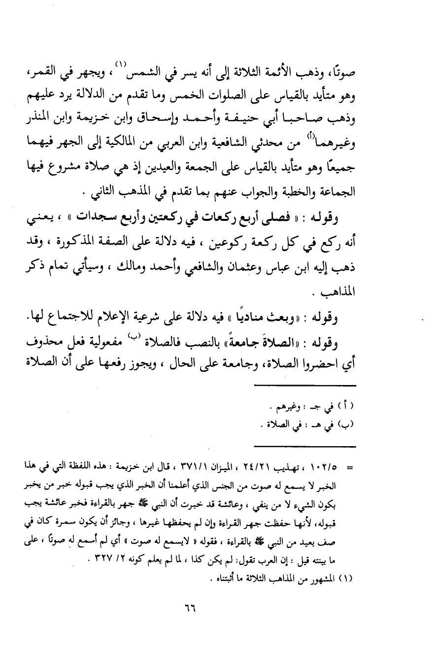 صوتًا، وذهب الأئمة الثلاثة إلى أنه يسر في الشمس (¬1)، ويجهر في القمر، وهو متأيد بالقياس على الصلوات الخمس وما تقدم من الدلالة يرد عليهم وذهب صاحبا أبي حنيفة وأحمد وإسحاق وابن خزيمة وابن المنذر وغيرهما (أ) من محدثي الشافعية وابن العربي من المالكية إلى الجهر فيهما جميعًا وهو متأيد بالقياس على الجمعة والعيدين إذ هي صلاة مشروع فيها الجماعة والخطبة والجواب عنهم بما تقدم في المذهب الثاني.