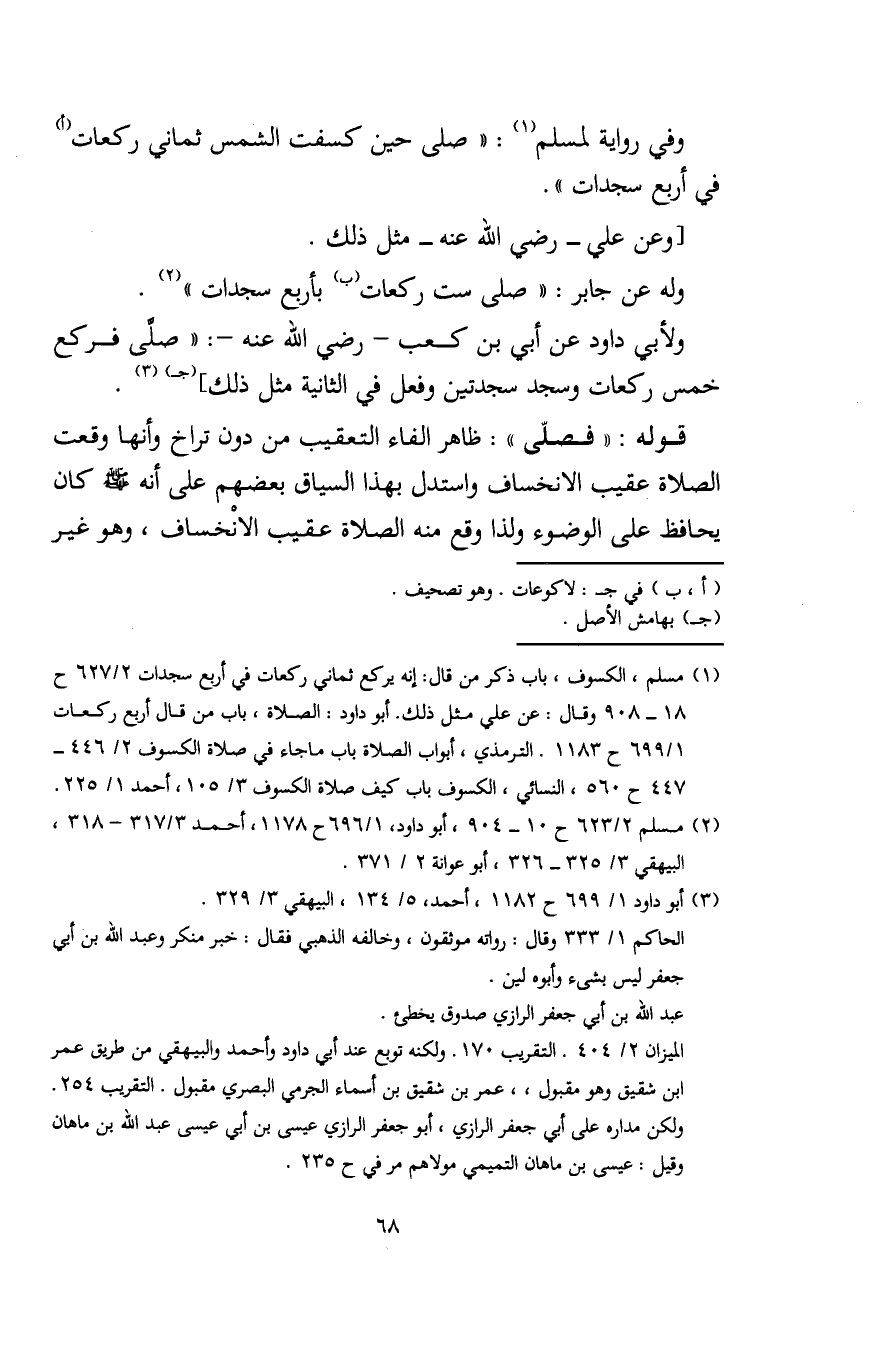 (¬1) مسلم، الكسوف، باب ذكر من قال: إنه يركع ثماني ركعات في أربع سجدات 2/ 627 ح 18 - 908 وقال: عن علي مثل ذلك. أبو داود: الصلاة، باب من قال أربع ركعات 1/ 699 ح 1183. الترمذي، أبواب الصلاة باب ما جاء في صلاة الكسوف 2/ 446 - 447 ح 560، النسائي، الكسوف باب كيف صلاة الكسوف 3/ 105، أحمد 1/ 225.