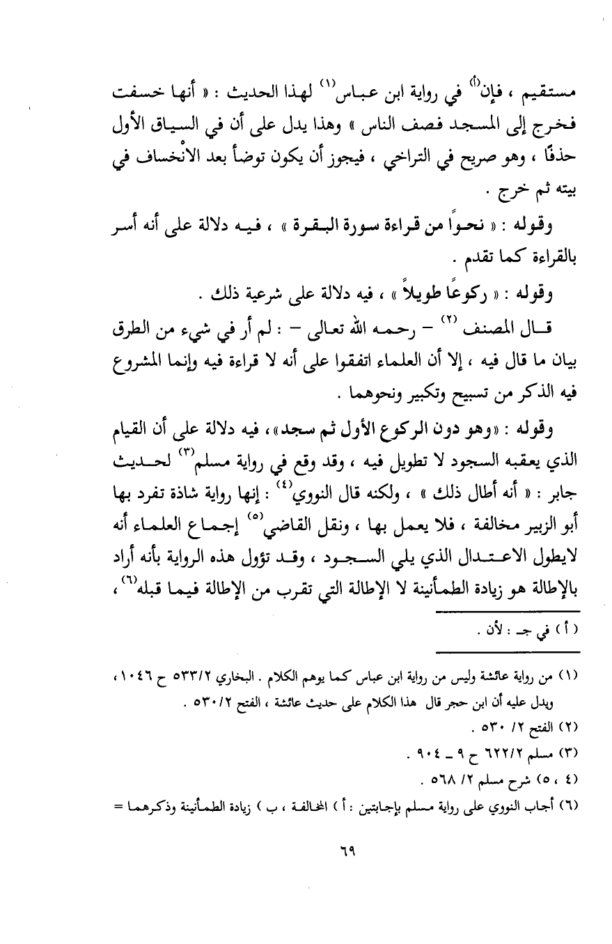 وقوله: "وهو دون الركوع الأول ثم سجد"، فيه دلالة على أن القيام الذي يعقبه السجود لا تطويل فيه، وقد وقع في رواية مسلم (¬3) لحديث جابر: "أنه أطال ذلك"، ولكنه قال النووي (¬4): إنها رواية شاذة تفرد بها أبو الزبير مخالفة، فلا يعمل بها، ونقل القاضي (¬5) إجماع العلماء أنه لا يطول الاعتدال الذي يلي السجود، وقد تؤول هذه الرواية بأنه أراد بالإطالة هو زيادة الطمأنينة لا الإطالة التي تقرب من الإطالة فيما قبله (¬6)،