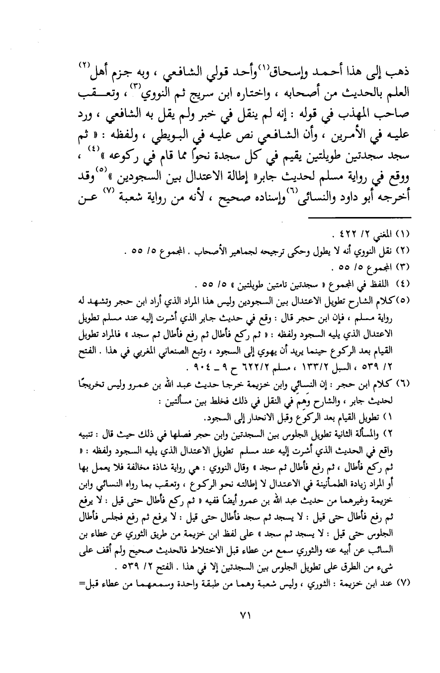 (¬5) كلام الشارح تطويل الاعتدال ببن السجودين وليس هذا المراد الذي أراد ابن حجر وتشهد له رواية مسلم، فإن ابن حجر قال: وقع في حديث جابر الذي أشرت إليه عند مسلم تطويل الاعتدال الذي يليه السجود ولفظه: "ثم ركع فأطال ثم رفع فأطال ثم سجد" فالمراد تطويل القيام بعد الركوع حينما يريد أن يهوي إلى السجود، وتبع الصنعاني المغربي في هذا. الفتح 2/ 539، السبل 2/ 133، مسلم 2/ 622 ح 9 - 904.