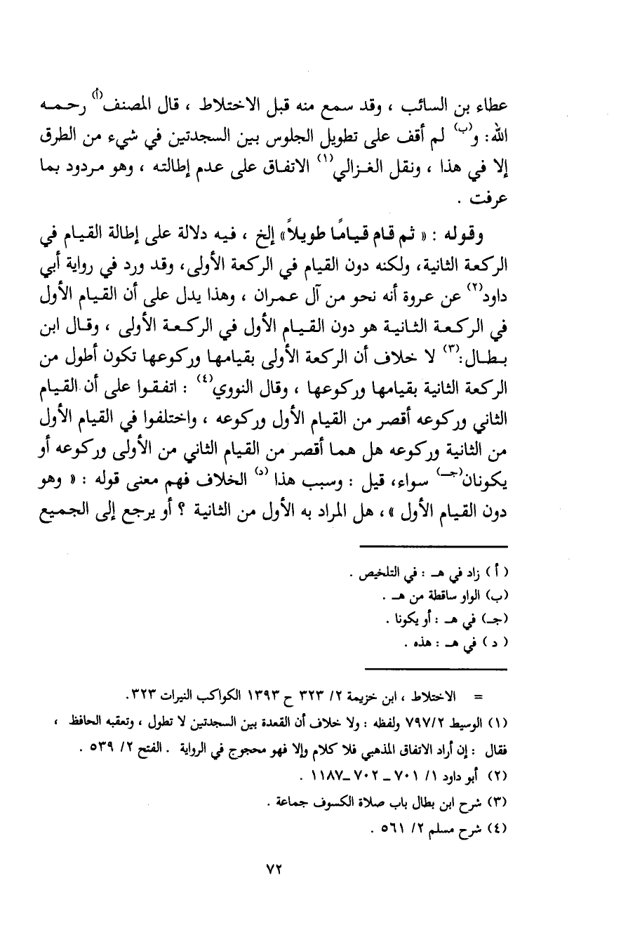(¬1) الوسيط 2/ 797 ولفظه: ولا خلاف أن القعدة بين السجدتين لا تطول، وتعقبه الحافظ، فقال: إن أراد الاتفاق المذهبي فلا كلام وإلا فهو محجوج في الرواية. الفتح 2/ 539.