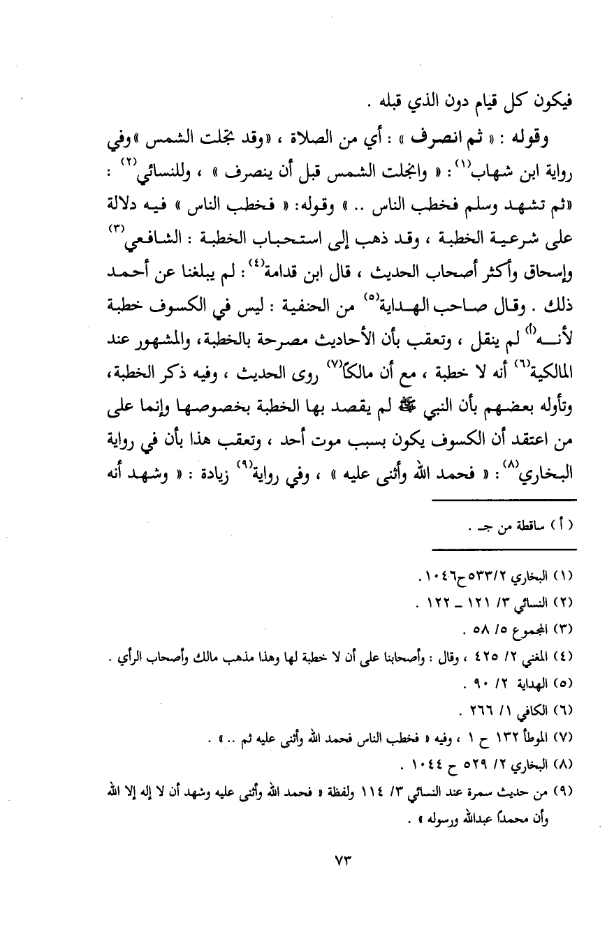 وقوله: "ثم انصرف": أي من الصلاة، "وقد تجلت الشمس" وفي رواية ابن شهاب (¬1): "وانجلت الشمس قبل أن ينصرف"، وللنسائي (¬2): "ثم تشهد وسلم فخطب الناس .. " وقوله: "فخطب الناس" فيه دلالة على شرعية الخطبة، وقد ذهب إلى استحباب الخطبة: الشافعي (¬3) وإسحاق وأكثر أصحاب الحديث، قال ابن قدامة (¬4): لم يبلغنا عن أحمد ذلك. وقال صاحب الهداية (¬5) من الحنفية: ليس في الكسوف خطبة لأنه (أ) لم ينقل، وتعقب بأن الأحاديث مصرحة بالخطبة، والمشهور عند المالكية (¬6) أنه لا خطبة، مع أن مالكًا (¬7) روى الحديث، وفيه ذكر الخطبة، وتأوله بعضهم بأن النبي - صلى الله عليه وسلم - لم يقصد بها الخطبة بخصوصها وإنما على من اعتقد أن الكسوف يكون بسبب موت أحد، وتعقب هذا بأن في رواية البخاري (¬8): "فحمد الله وأثنى عليه"، وفي رواية (¬9) زيادة: "وشهد أنه