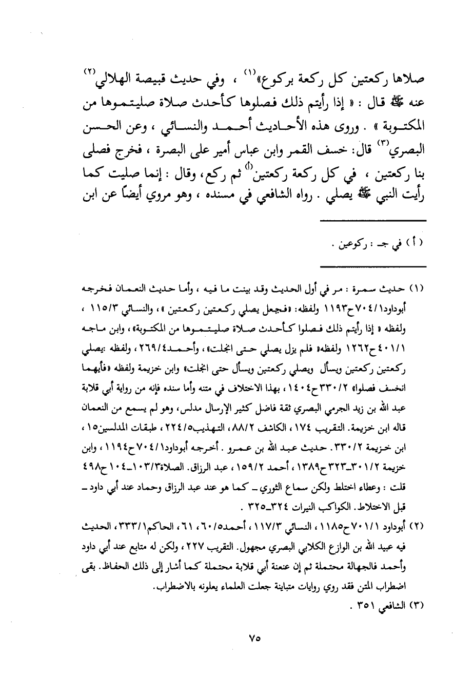 (¬1) حديث سمرة: مر في أول الحديث وقد بينت ما فيه، وأما حديث النعمان فخرجه أبو داود 1/ 704 ح 1193 ولفظه: "فجعل يصلي ركعتين ركعتين"، والنسائي 3/ 115، ولفظه "إذا رأيتم ذلك فصلوا كأحدث صلاة صليتموها من المكتوبة"، وابن ماجه 1/ 401 ح 1262 ولفظه "فلم يزل يصلي حتى انجلت"، وأحمد 4/ 269، ولفظه: يصلي ركعتين ركعتين ويسأل ويصلي ركعتين ويسأل حتى انجلت" وابن خزيمة ولفظه "فأيهما انخسف فصلوا" 2/ 330 ح 1404، بهذا الاختلاف في متنه وأما سنده فإنه من رواية أبي قلابة عبد الله بن زيد الجرمي البصري ثقة فاضل كثير الإرسال مدلس، وهو لم يسمع من النعمان قاله ابن خزيمة. التقريب 174، الكاشف 2/ 88، التهذيب 5/ 224، طبقات المدلسين 15، ابن خزيمة 2/ 330. حديث عبد الله بن عمرو. أخرجه أبو داود 1/ 704 ح 1194، وابن خزيمة 2/ 301 - 323 ح 1389، أحمد 2/ 159، عبد الرزاق. الصلاة 3/ 103 - 104 ح 498 قلت: وعطاء اختلط ولكن سماع الثوري -كما هو عند عبد الرزاق وحماد عند أبي داود- قبل الاختلاط. الكواكب النيرات 324 - 325.