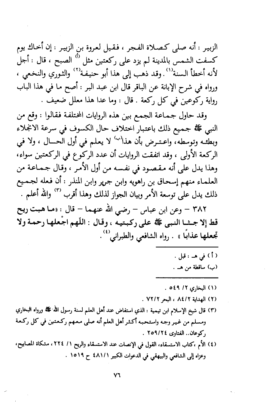 (¬3) قال شيخ الإسلام ابن تيمية: الذي استفاض عند أهل العلم لسنة رسول الله - صلى الله عليه وسلم - ورواه البخاري ومسلم من غير وجه واستحبه أكثر أهل العلم أنه صلى معهم ركعتين في كل ركعة ركوعان .. الفتاوى 24/ 259.