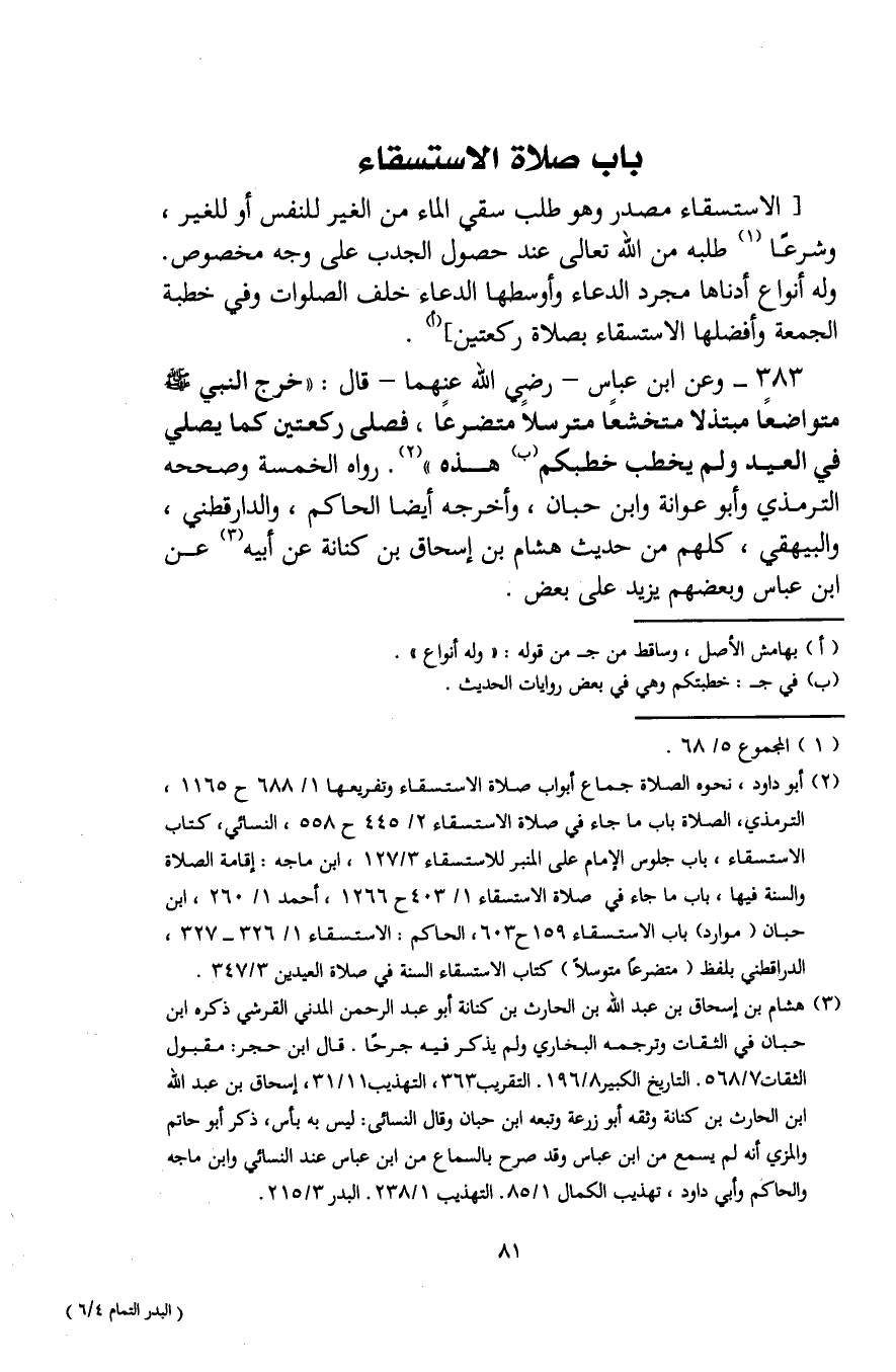 383 - وعن ابن عباس - رضي الله عنهما - قال: "خرج النبي - صلى الله عليه وسلم - متواضعًا مبتذلا متخشعًا مترسلًا متضرعًا، فصلى ركعتين كما يصلي في العيد ولم يخطب خطبكم (ب) هذه" (¬2). رواه الخمسة وصححه الترمذي وأبو عوانة وابن حبان، وأخرجه أيضًا الحاكم، والدارقطني، والبيهقي، كلهم من حديث هشام بن إسحاق بن كنانة عن أبيه (¬3) عن ابن عباس وبعضهم يزيد على بعض.
