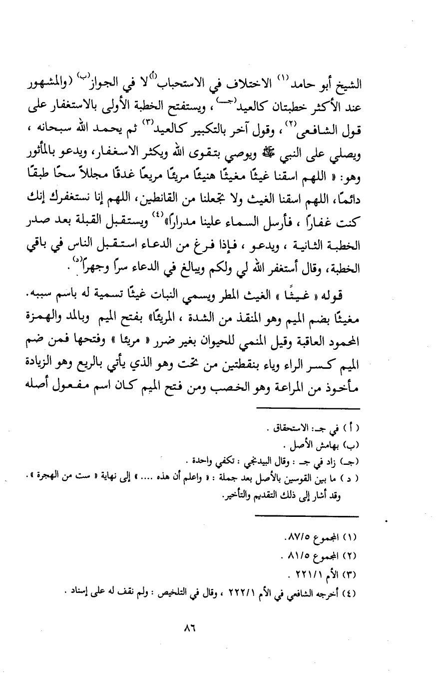 قوله "غيثًا" الغيث المطر ويسمي النبات غيثًا تسمية له باسم سببه. مغيثًا بضم الميم وهو المنقذ من الشدة، المريئًا بفتح الميم وبالمد والهمزة المحمود العاقبة وقيل المنمي للحيوان بغير ضرر "مريئا" وفتحها فمن ضم الميم كسر الراء وياء بنقطتين من تحت وهو الذي يأتي بالريع وهو الزيادة مأخوذ من المراعة وهو الخصب ومن فتح الميم كان اسم مفعول أصله