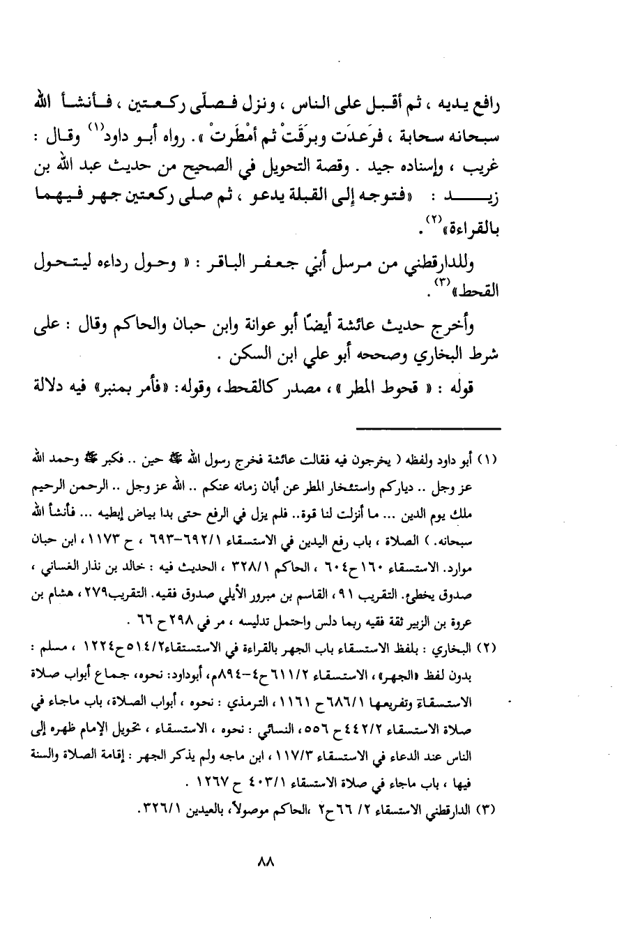 (¬1) أبو داود ولفظه (يخرجون فيه فقالت عائشة فخرج رسول الله - صلى الله عليه وسلم - حين .. فكبر - صلى الله عليه وسلم - وحمد الله عزَّ وجلَّ .. دياركم واستئخار المطر عن أبان زمانه عنكم .. الله عزَّ وجلَّ .. الرحمن الرحيم ملك يوم الدين ... ما أنزلت لنا قوة .. فلم يزل في الرفع حتى بدا بياض إبطيه ... فأنشأ الله سبحانه.) الصلاة، باب رفع اليدين في الاستسقاء 1/ 692 - 693، ح 1173، ابن حبان موارد. الاستسقاء 160 ح 604، الحاكم 1/ 328، الحديث فيه: خالد بن نذار الغساني، صدوق يخطئ. التقريب 91، القاسم بن مبرور الأيلي صدوق فقيه. التقريب 279، هشام بن عروة بن الزبير ثقة فقيه ربما دلس واحتمل تدليسه، مر في 298 ح 66.