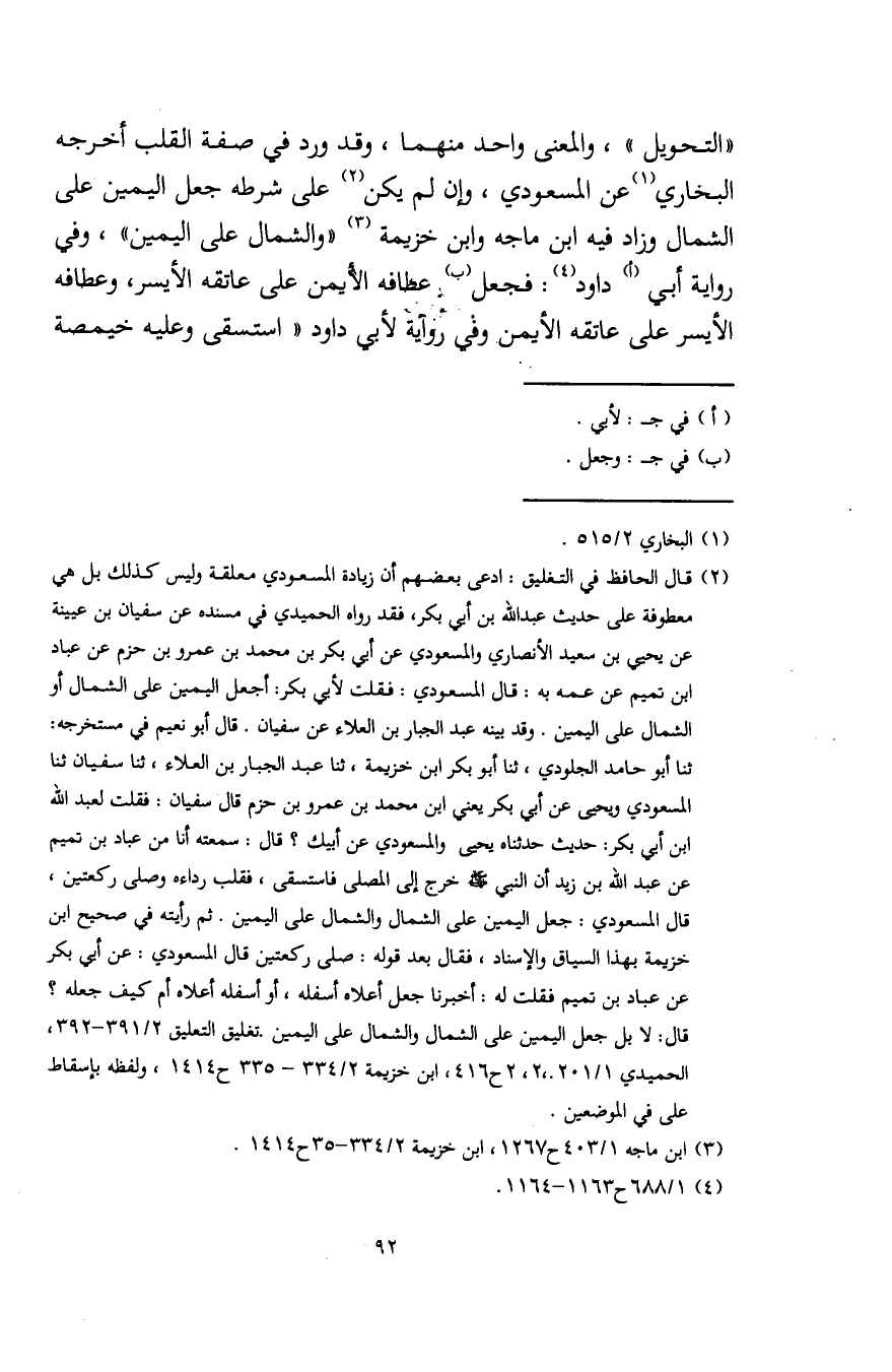 (¬2) قال الحافظ في التغليق: ادعى بعضهم أن زيادة المسعودي معلقة وليس كذلك بل هي معطوفة على حديث عبد الله بن أبي بكر، فقد رواه الحميدي في مسنده عن سفيان بن عيينة عن يحيى بن سعيد الأنصاري والمسعودي عن أبي بكر بن محمد بن عمرو بن حزم عن عباد بن تميم عن عمه به: قال المسعودي: فقلت لأبي بكر: أجعل اليمين على الشمال أو الشمال على اليمين. وقد بينه عبد الجبار بن العلاء عن سفيان. قال أبو نعيم في مستخرجه: ثنا أبو حامد الجلودي، ثنا أبو بكر ابن خزيمة، ثنا عبد الجبار بن العلاء، ثنا سفيان ثنا المسعودي ويحيى عن أبي بكر يعني ابن محمد بن عمرو بن حزم قال سفيان: فقلت لعبد الله ابن أبي بكر: حديث حدثناه يحيى والمسعودي عن أبيك؟ قال: سمعته أنا من عباد بن تميم عن عبد الله بن زيد أن النبي - صلى الله عليه وسلم - خرج إلى المصلى فاستسقى، فقلب رداءه وصلى ركعتين، قال المسعودي: جعل اليمين على الشمال والشمال على اليمين. ثم رأيته في صحيح ابن خزيمة بهذا السياق والإسناد، فقال بعد قوله: صلى ركعتين قال المسعودي: عن أبي بكر عن عباد بن تميم فقلت له: أخبرنا جعل أعلاه أسفله، أو أسفله أعلاه أم كيف جعله؟ قال: لا بل جعل اليمين على الشمال والشمال على اليمين. تغليق التعليق 2/ 391 - 392، الحميدي 1/ 201، 202 ح 416، ابن خزيمة 2/ 334 - 335 ح 1414، ولفظه بإسقاط على في الموضعين.