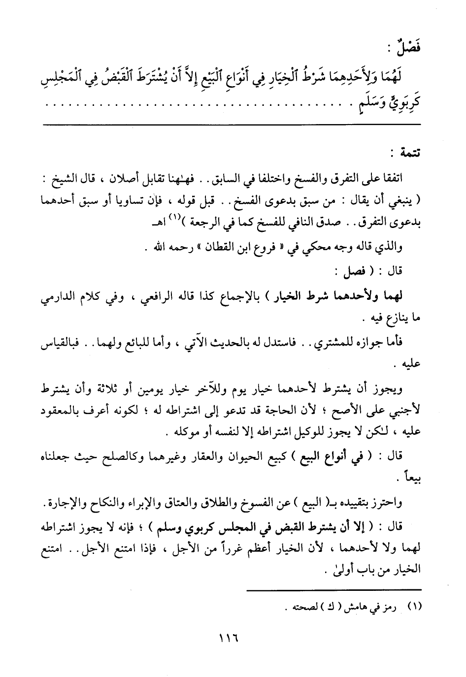 قال: (إلا أن يشترط القبض في المجلس كربوي وسلم)؛ فإنه لا يجوز اشتراطه لهما ولا لأحدهما، لأن الخيار أعظم غررًا من الأجل، فإذا امتنع الأجل .. امتنع الخيار من باب أولى.