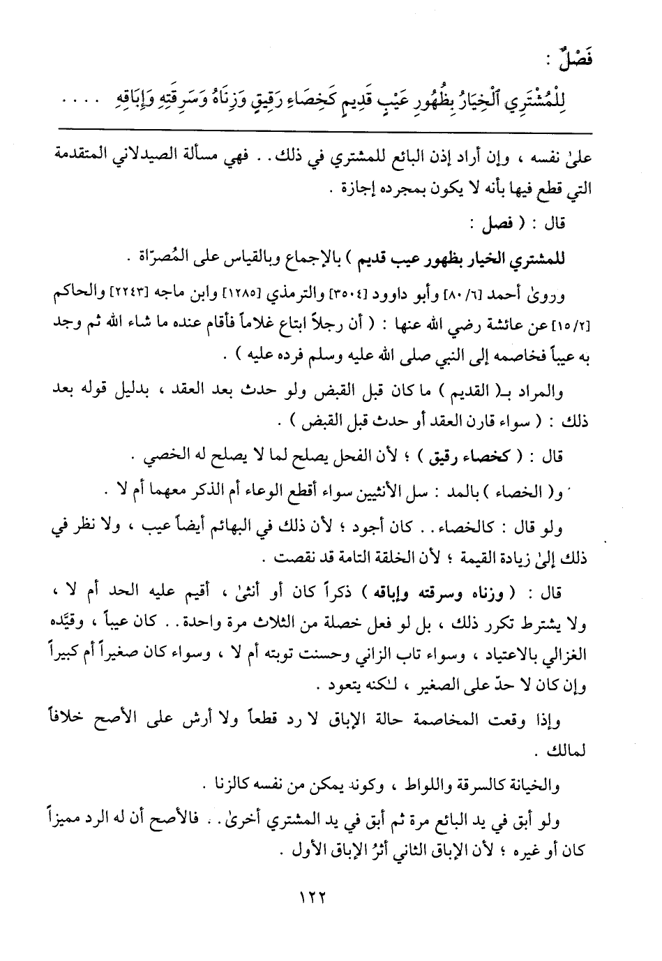 لِلْمُشْتَرِي الْخِيَارُ بِظُهُورِ عَيْبٍ قَدِيمٍ كَخِصَاءِ رَقِيقٍ وَزِنَاهُ وَسَرِقَتِهِ وَإِبَاقِهِ