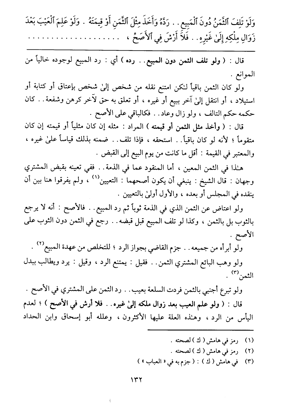 وَلَوْ تَلِفَ الثَّمَنُ دُونَ الْمَبِيعِ .. رَدَّهُ وَأَخَذَ مِثْلَ الثَّمَنِ أَوْ قِيمَتَهُ. وَلَوْ عَلِمَ الْعَيْبَ بَعْدَ زَوَالِ مِلْكِهِ إِلَى غَيْرِهِ .. فَلَا أَرْشَ فِي الأَصَحِّ،