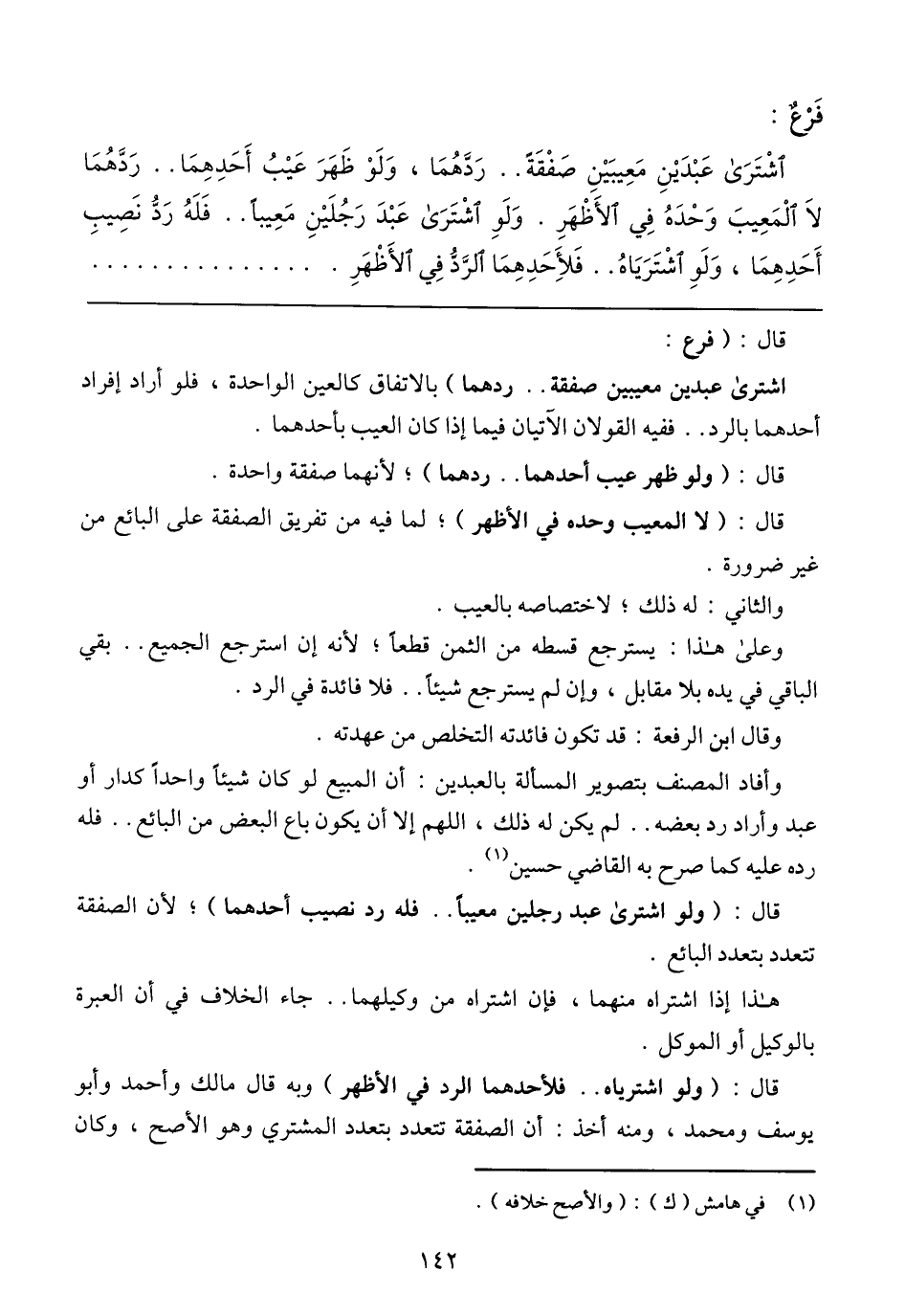 اشْتَرَى عَبْدَيْنِ مَعِيبَيْنِ صَفْقَةً .. رَدَّهُمَا، وَلَوْ ظَهَرَ عَيْبُ أَحَدِهِمَا .. رَدَّهُمَا لَا الْمَعِيبَ وَحْدَهُ فِي الأَظْهَرِ. وَلَوِ اشْتَرَى عَبْدَ رَجُلَيْنِ مَعِيبًا .. فَلَهُ رَدُّ نَصِيبِ أَحَدِهِمَا، وَلَوِ اشْتَرَيَاهُ .. فَلِأَحَدِهِمَا الرَّدُّ فِي الأَظْهَرِ